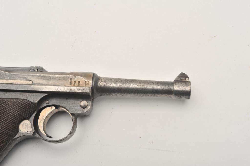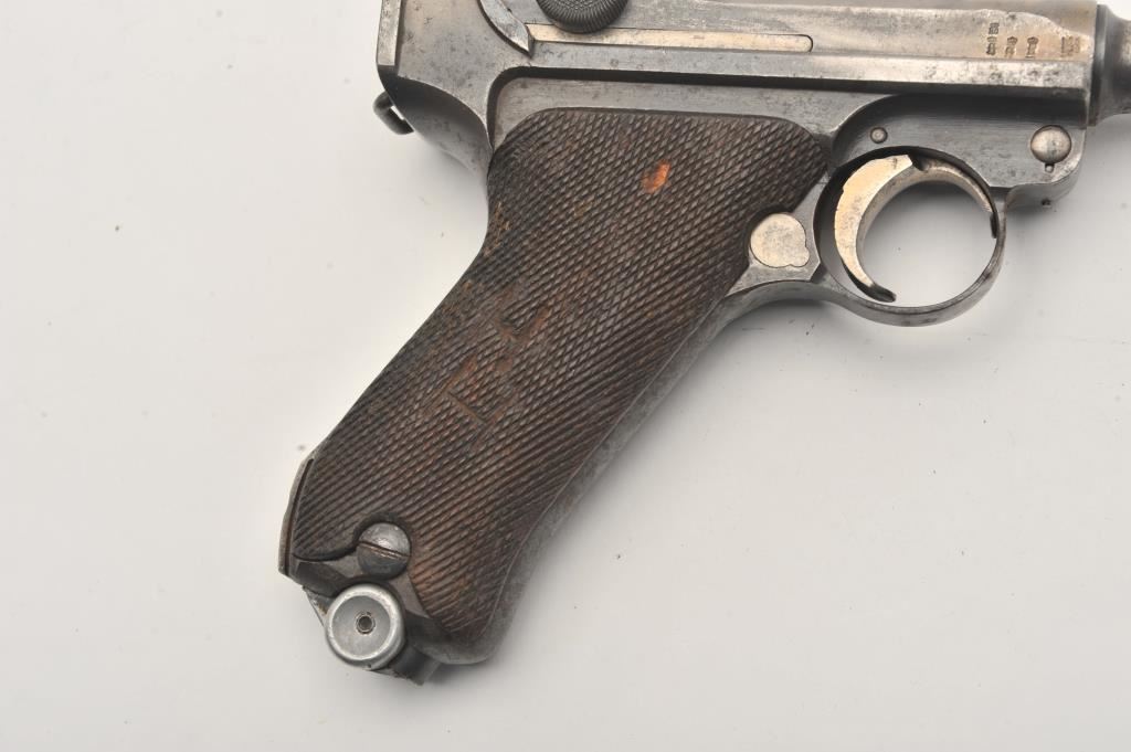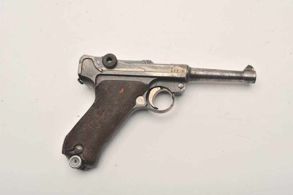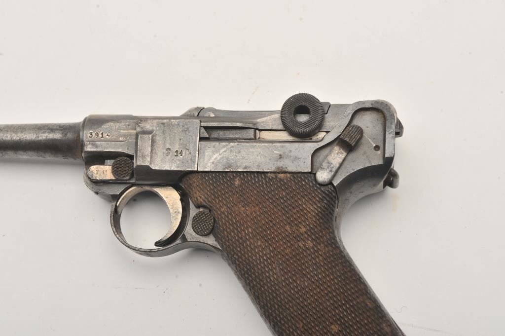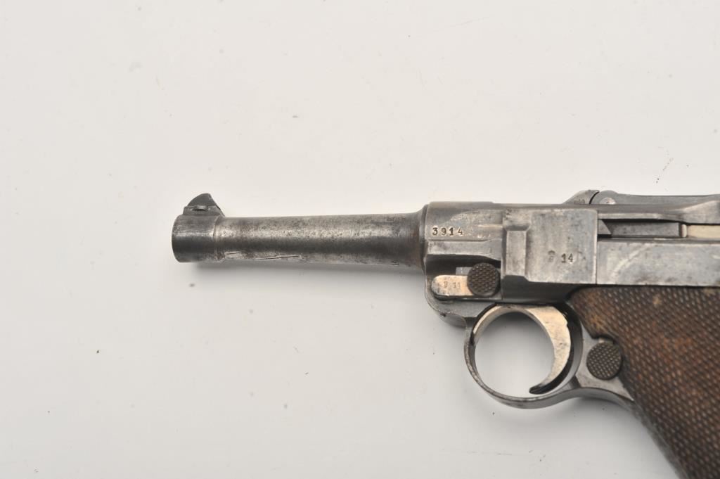 Erfurt Luger semi-automatic pistol, 9mm caliber, Serial #3914. The pistol is in fair overall condition with a 4” barrel. The pistol retains a significant amount of muted blue finish with the remainder going to silver/grey patina with several scratches on the barrel. The front and back straps show light to moderate surface rust. The frame has numerous proof marks and the front ring is dated 1916. The trigger and various small parts show old, toning straw finish. The checkered wood grips are in fair condition showing moderate to heavy use with small mars, flattening of the checkering and the letters, “HH” carved into the right panel. The bore is fair, the action functions and the markings are legible. The lot includes one correct magazine. Est.: $350-$700. (C+R).