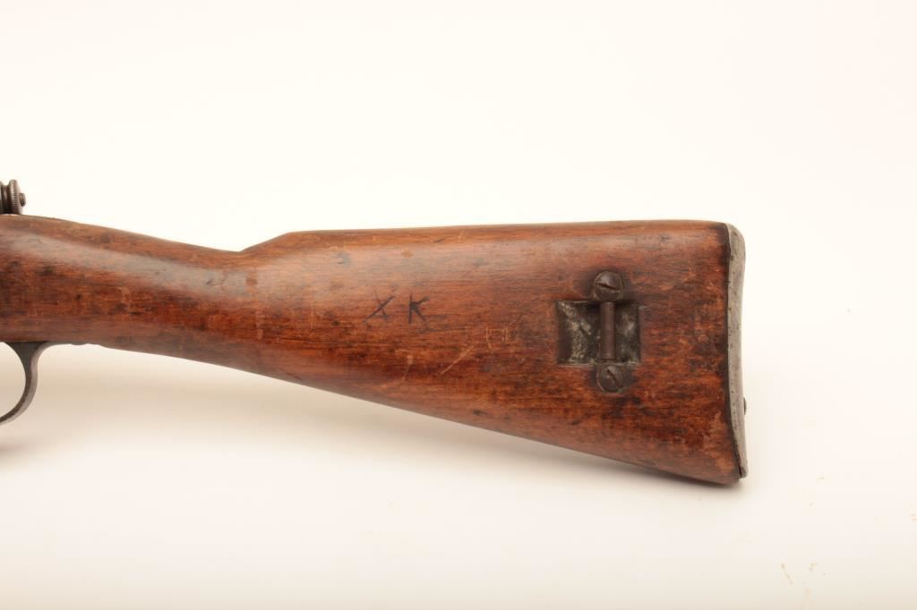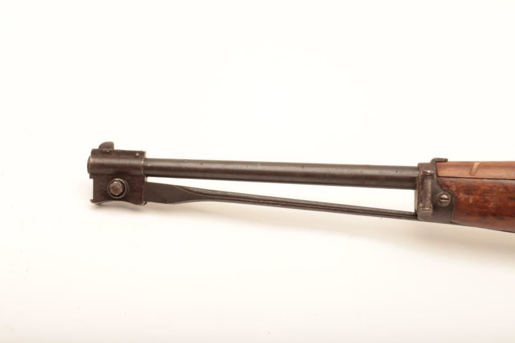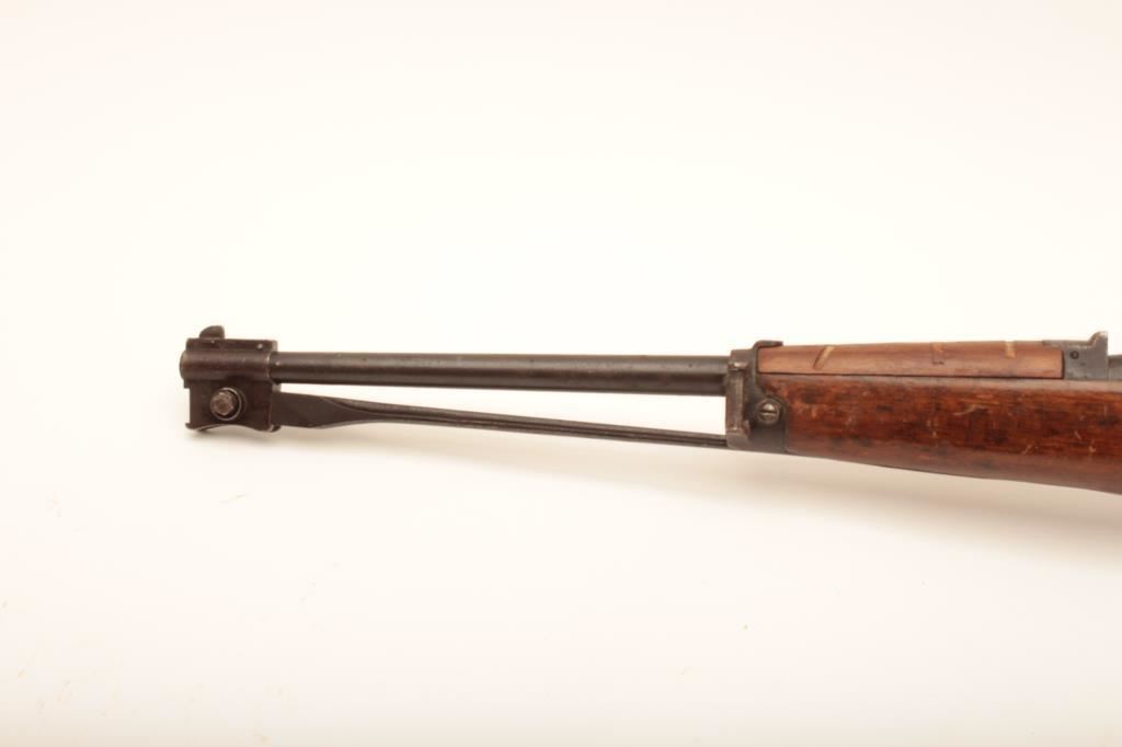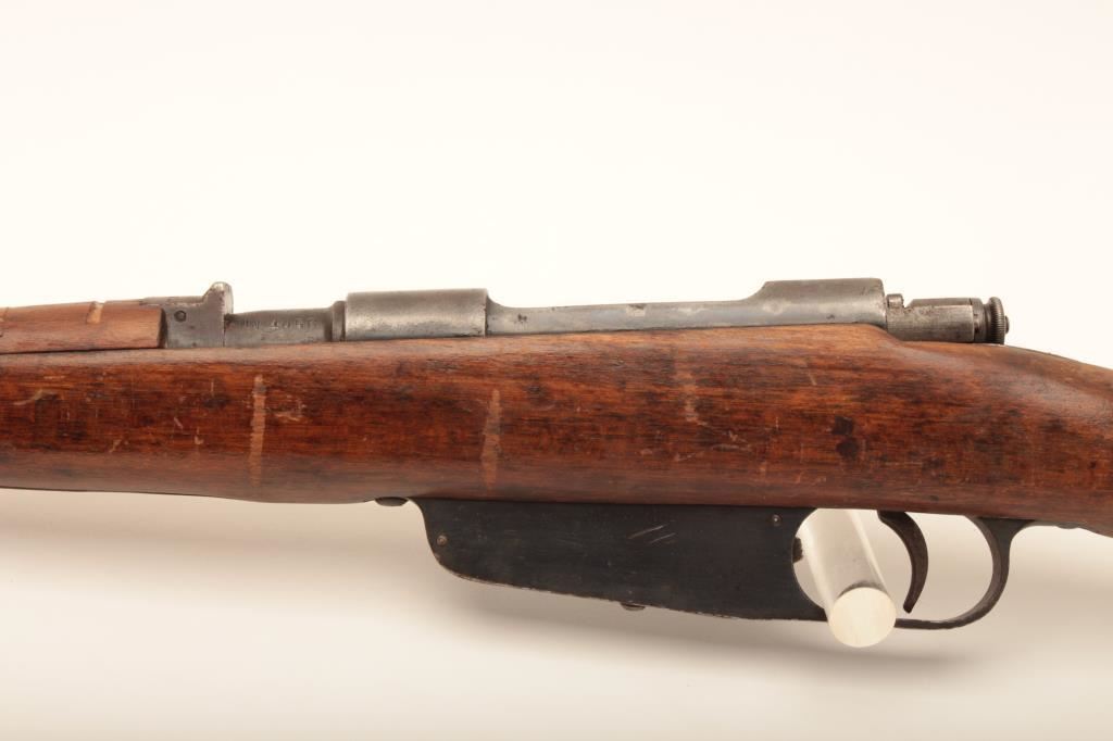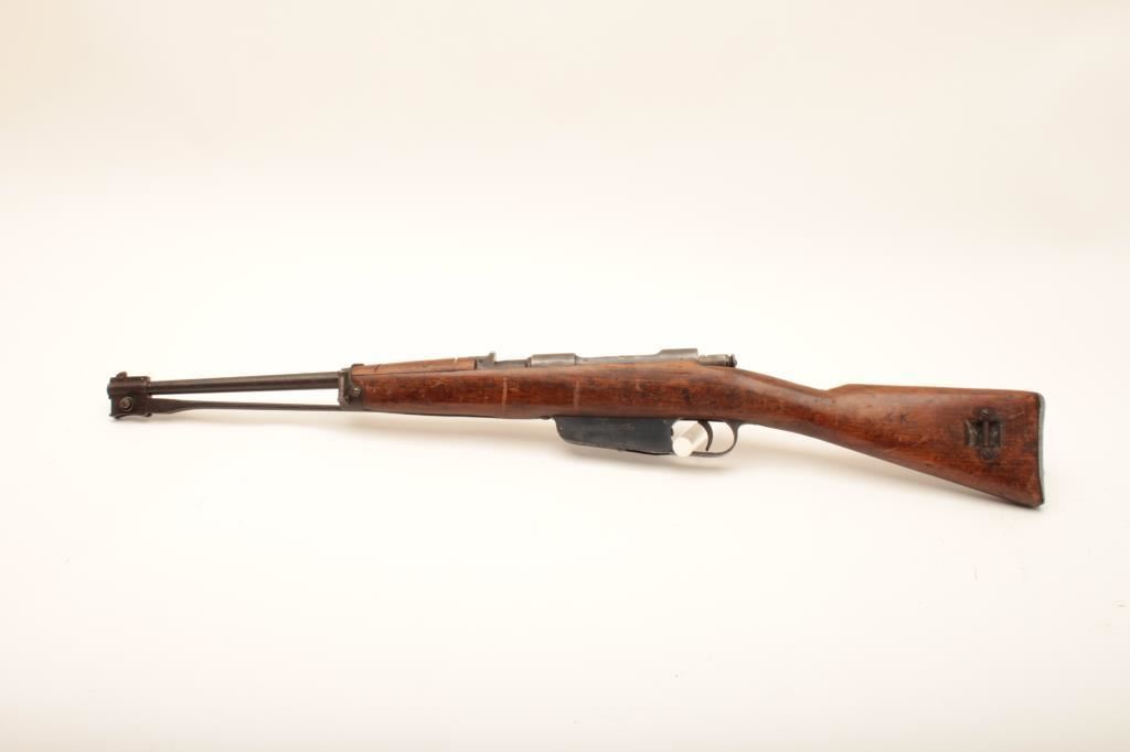 Italian Carcano Model 91 bolt action carbine by Beretta, 6.5 x 52 caliber, Serial #UN1056. The carbine is in good overall condition with an 18” barrel. The metal surfaces retain a significant amount of their military finish with the remainder going to dark grey patina. The carbine retains its folding bayonet and is marked Beretta and dated 1941 just ahead of the front ring. The smooth wood stock is in fair condition with dents, compressions and three 1” cuts in the front fore end. The butt stock ends with a smooth steel butt plate with trap. The bore is fair, the action functions and the markings are sharp on this WWII era Italian carbine. Est.: $200-$400. (C+R).
