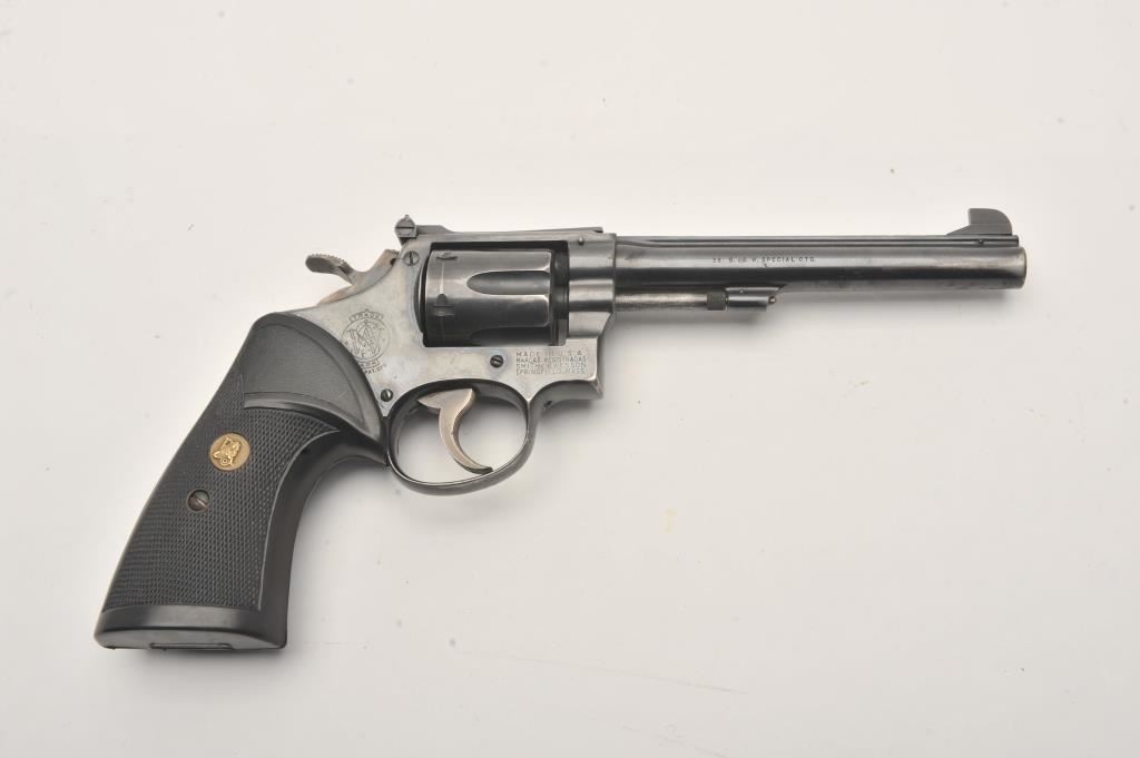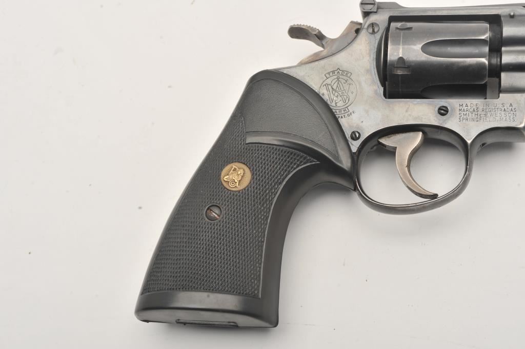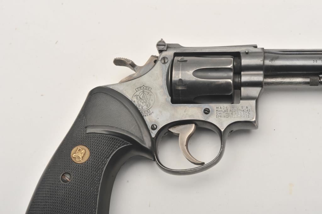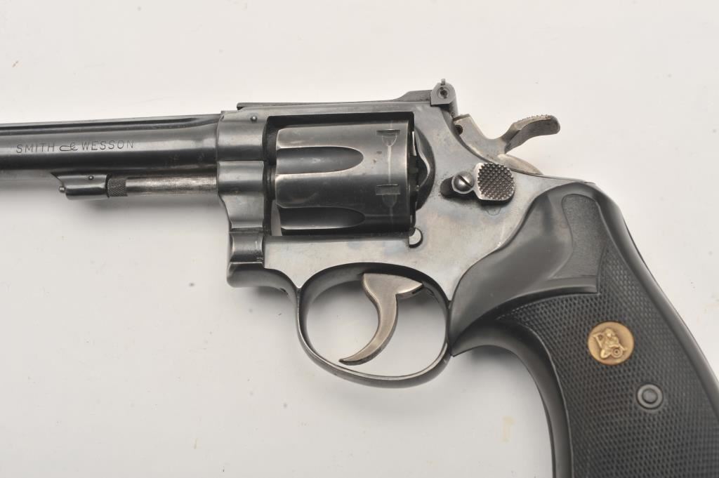 Smith & Wesson Model 15 revolver, .38 Special caliber, Serial #42288. The pistol is in good overall condition with a 6”pinned barrel with a ramped front and adjustable rear sights. The metal surfaces retain the majority of their blue finish with thinning finish on the barrel and the desirable four-screw frame. The hammer and trigger show muted case hardening. The checkered rubber Pachmayr combat grips are in very good condition. The bore is good, the action is crisp and markings are sharp on this Smith & Wesson K frame. Est.: $150-$300. (C+R).