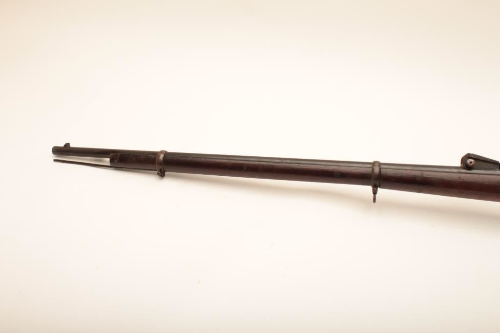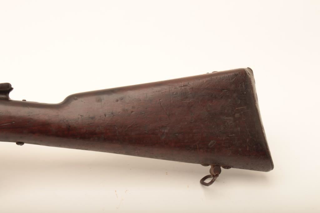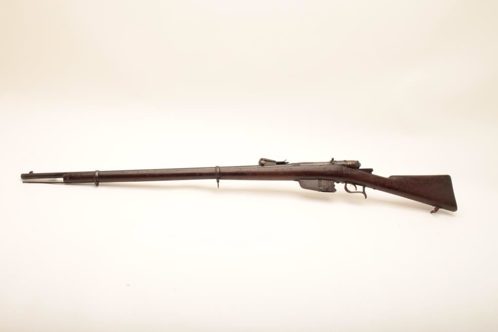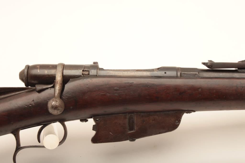 Italian Vetterli bolt action rifle, 7mm caliber, Serial #4890. The rifle is in fair overall condition with a 34” barrel. The metal surfaces retain a significant amount of their muted blue finish with the remainder going to a dark patina. The smooth wood stock is in fair condition with mars and compressions from carry and use, numerous cartouches and a non-matching serial number on the right side. The cleaning rod and sling swivels are retained and the butt stock ends with a smooth steel butt plate. The bore is fair, the action functions and the markings are legible. Est.: $125-$250. (Antique).