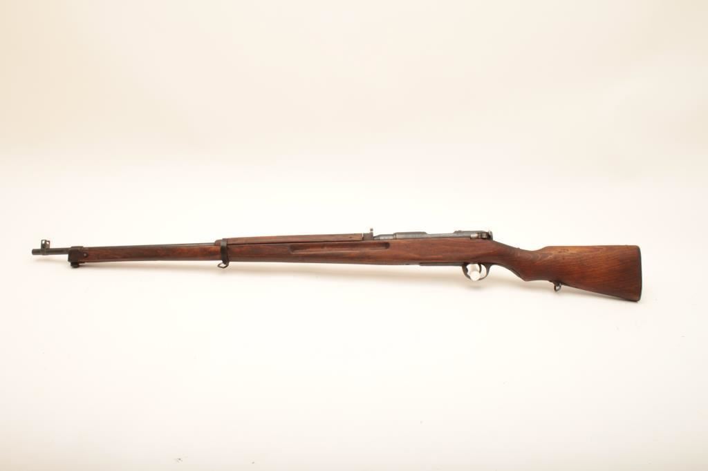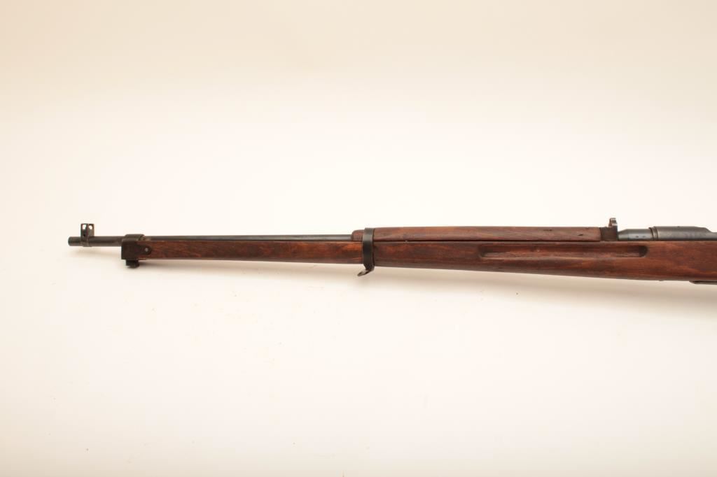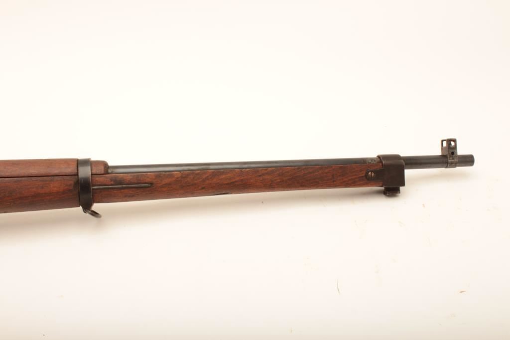 Japanese Type 38 bolt action training rifle, 6.5 x 50 caliber, Serial #NSNV. The rifle is in good overall condition with a 32” barrel with a protected blade front and peep style rear sights. The metal surfaces retain the majority of their military finish with a mum and Japanese characters on the front and a Kokura arsenal mark on the left side of the receiver. There is moderate pitting evident on the barrel at the front band and light surface rust on the magazine base plate. The smooth wood stock is in good overall condition with mars and compressions consistent with service use. The butt stock includes sling swivels and ends with a smooth steel butt plate. The bore is fair, the action crisp and markings are sharp on this desirable WWII Japanese trainer. Est.: $150-$300. (C+R).
