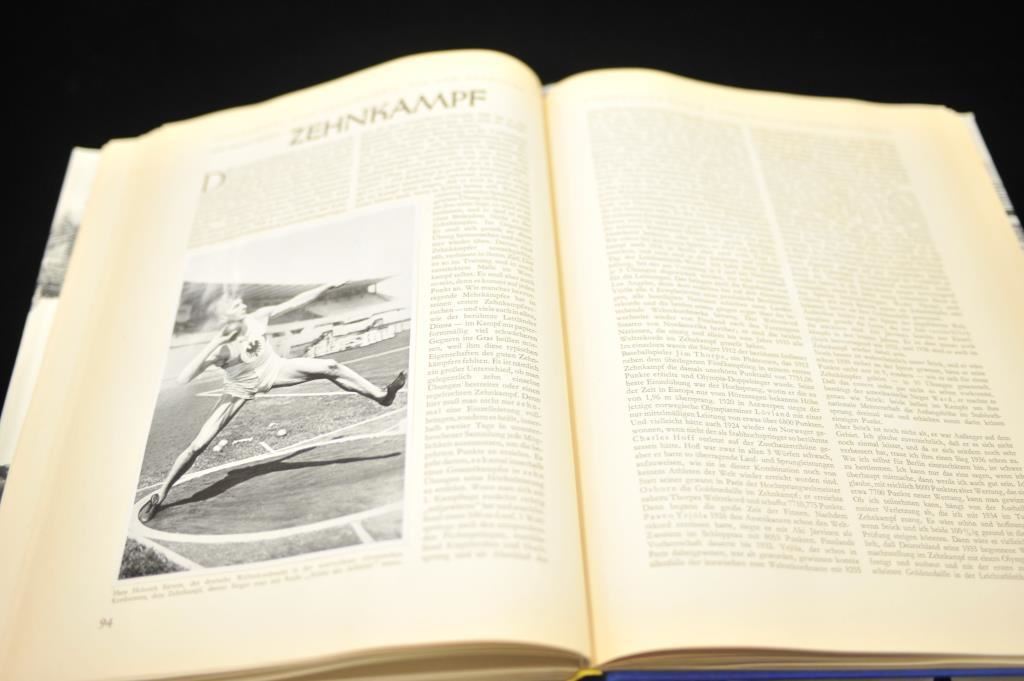 2 volume set 1936 Olympics with dust covers showing Nazi eagle. Inset photos. From German propaganda perspective. Minimizes Jesse Owens and maximizes German competitors. Boxing is totally slanted in story not mentioning Americans. Sound like fake news? Very good plus condition on both volumes. Minor rips and tears to dust jacket. Est.: $175-$350