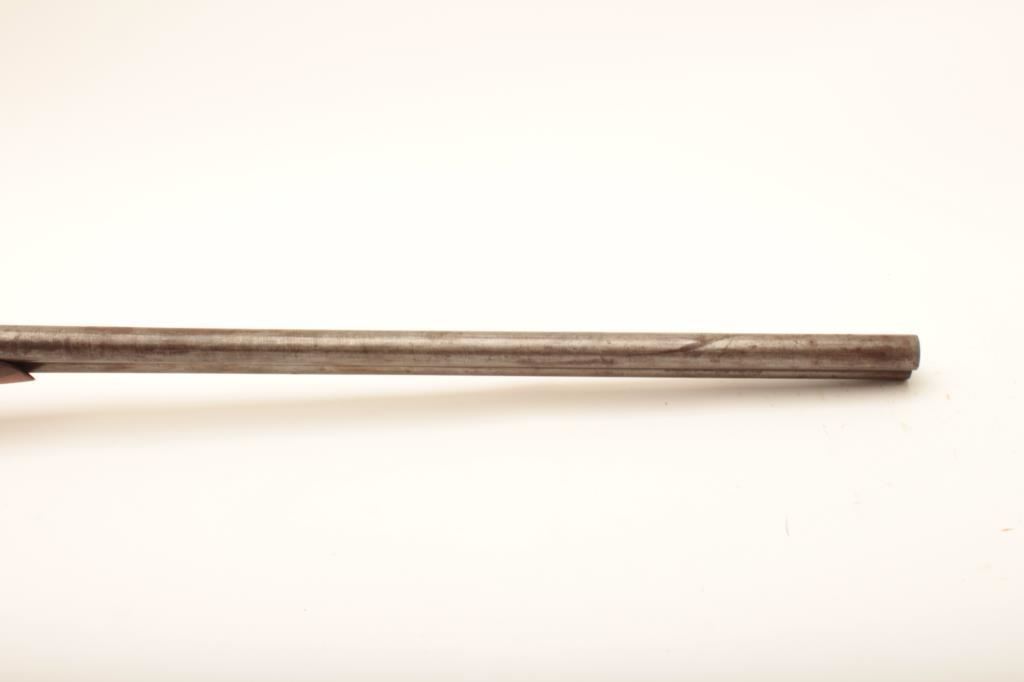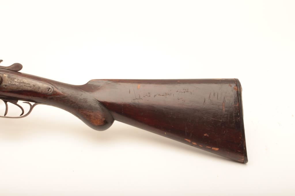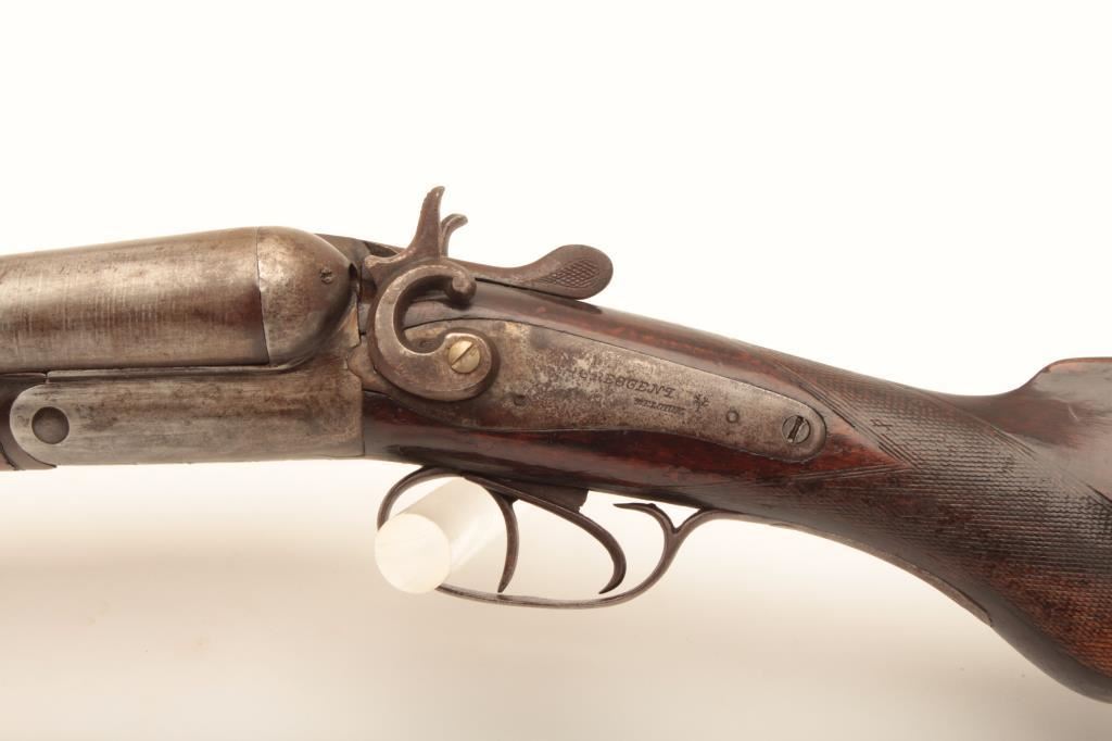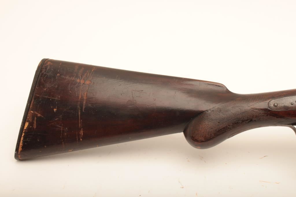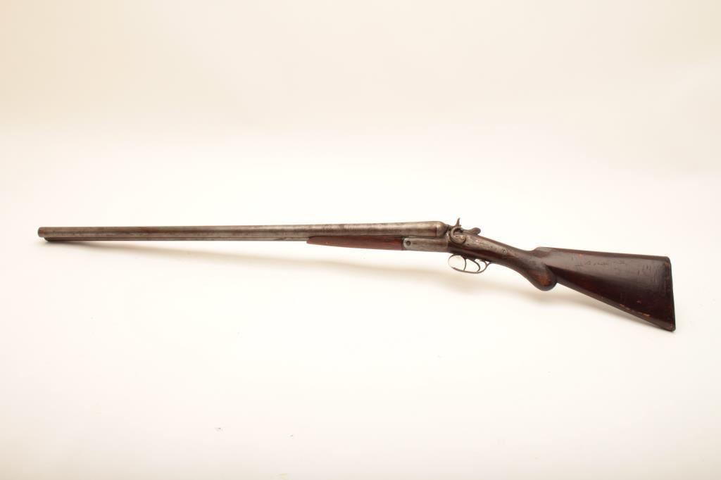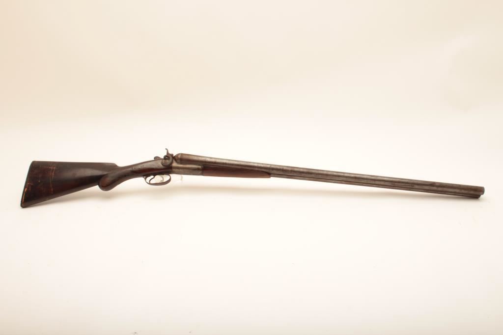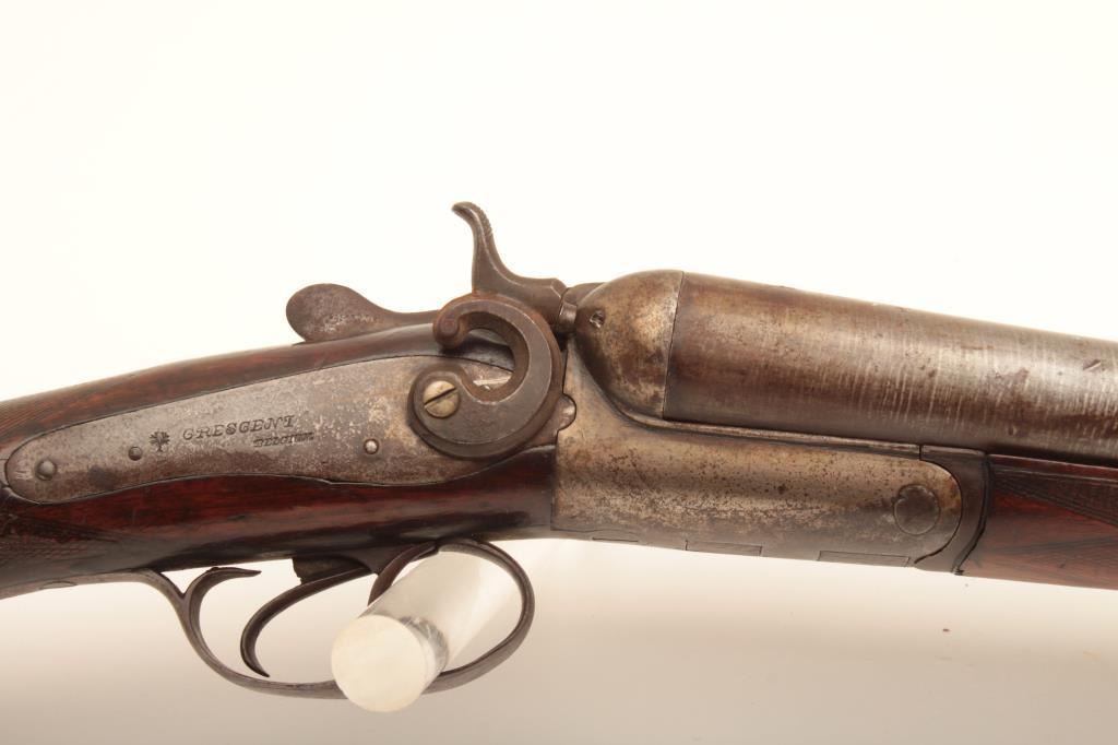 Crescent S x S hammer shotgun, 12 gauge, Serial #NSNV. The shotgun is in fair overall condition with 32” Damascus steel barrels with a full-length rib. The barrels have gone to a grey patina with areas of light surface erosion. The action is tight and appears to be on face. The side plates show old, silver toned case hardening and are marked, “CRESCENT BELGIUM”. The checkered wood stocks are in fair condition with a splinter fore end and end with a horn butt plate providing a 14 ½” LOP to the front trigger. The bores are fair, the action functions and the markings are sharp. Est.: $150-$300. (Antique).
