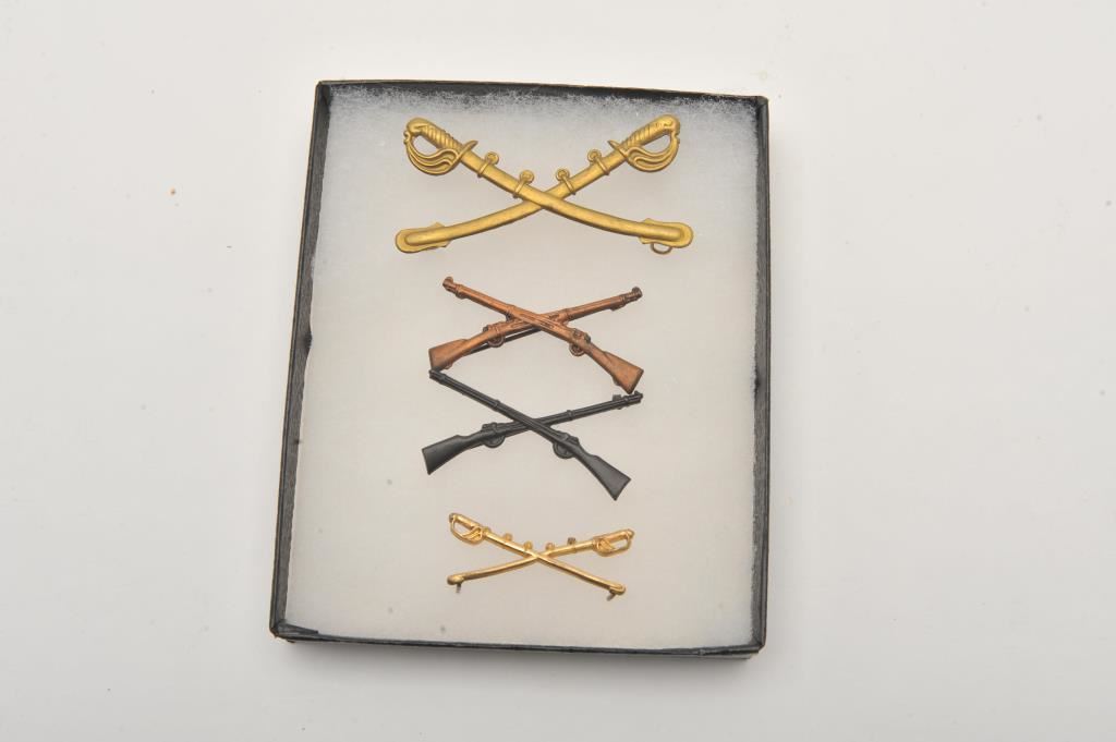 Lot of 4 U.S. military uniform emblems; 2 crossed swords and 2 crossed rifles; in riker case. Est.: $50-$75.