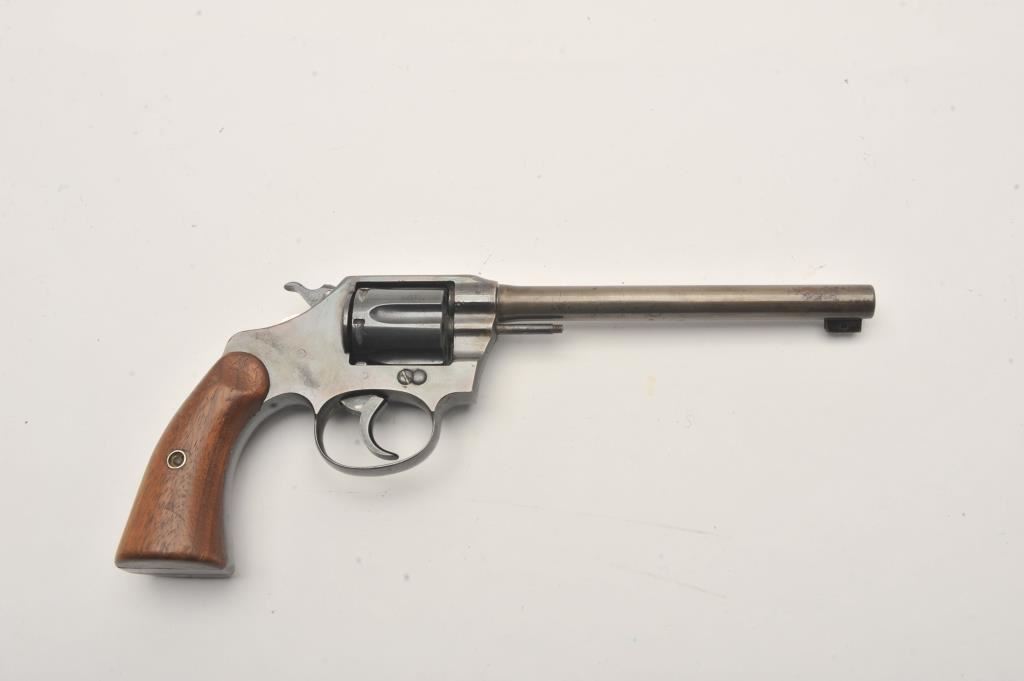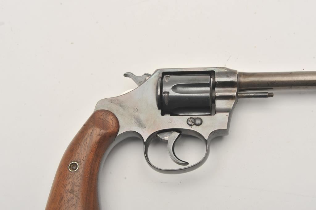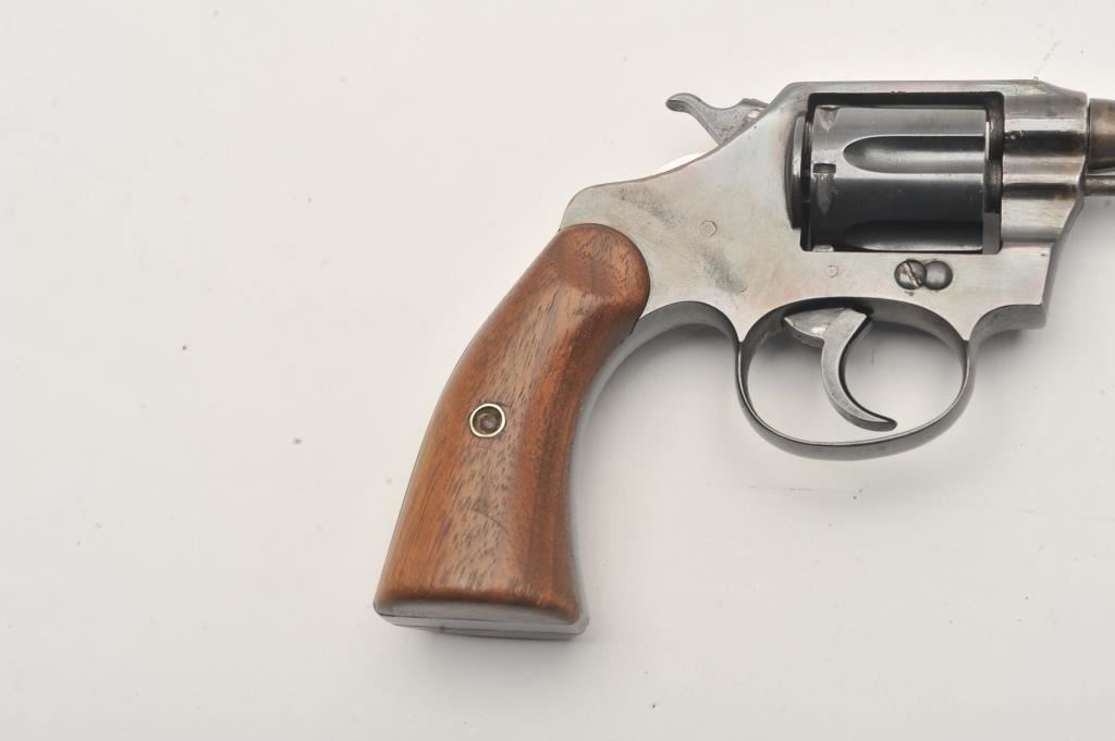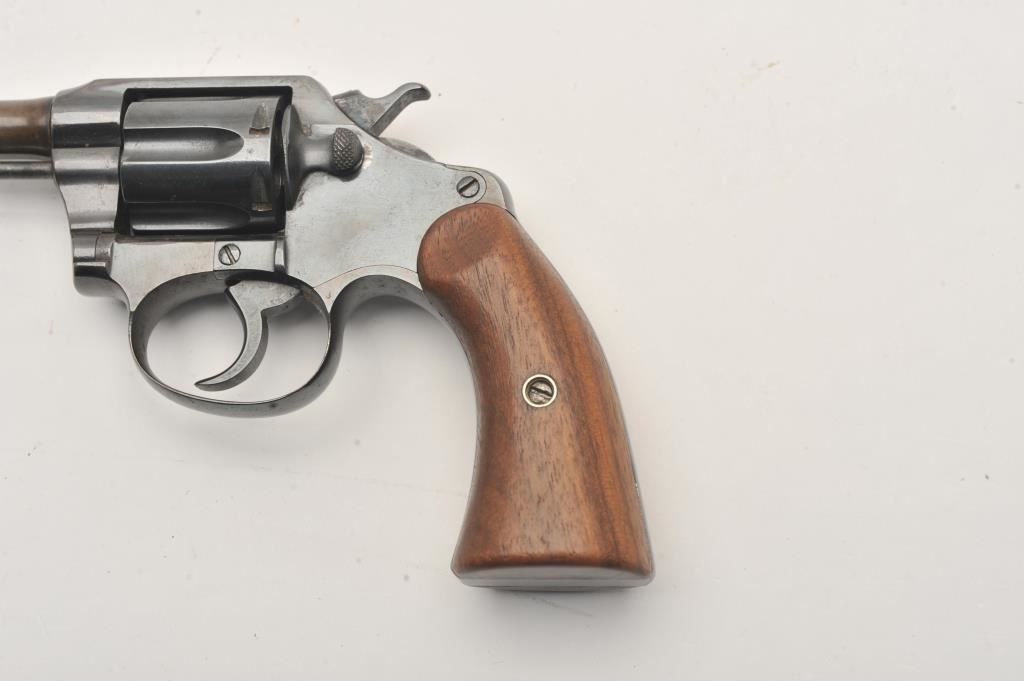Colt New Police revolver, .32 caliber, Serial #94996. The pistol is sold as parts with a 6” barrel. The front sight is missing and the barrel has been over-rotated and installed incorrectly. The metal surfaces retain a significant amount of their blue finish with the barrel a grey patina. The smooth wood grips are in good condition. The bore is fair and the action is non-functioning. Est.: $50-$100. (C+R).