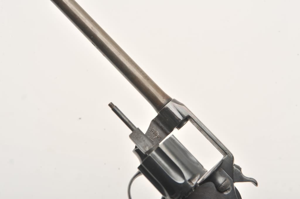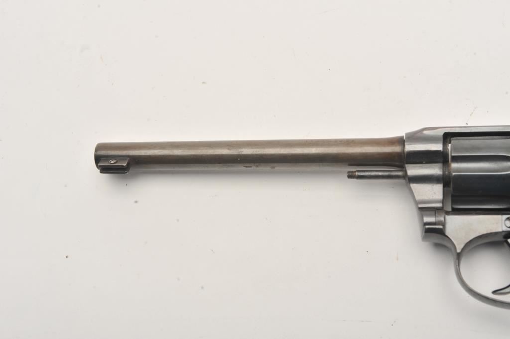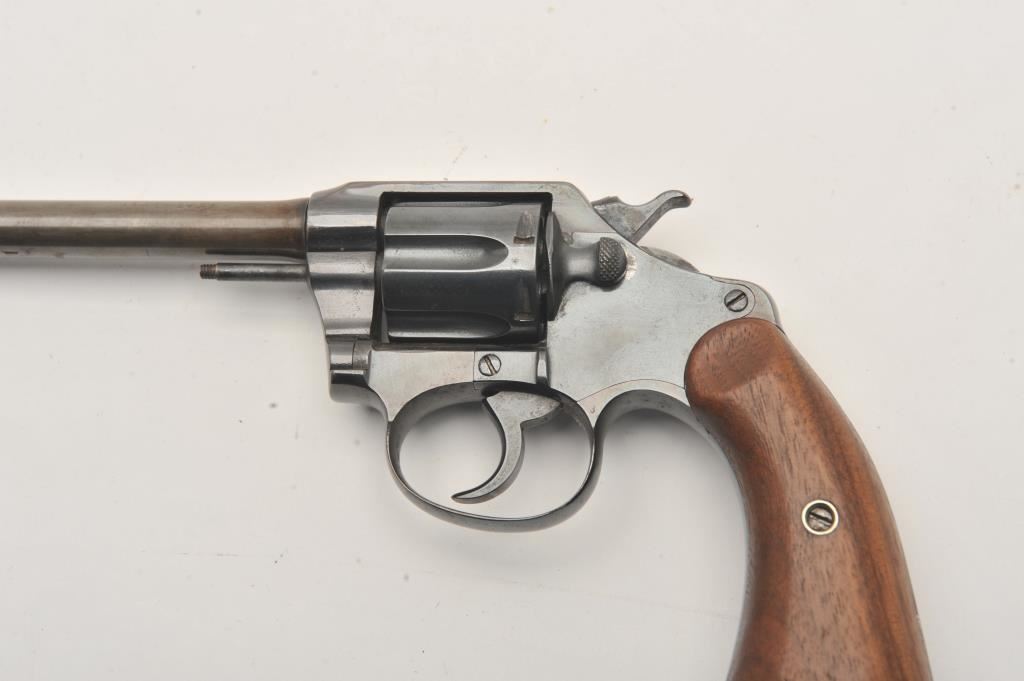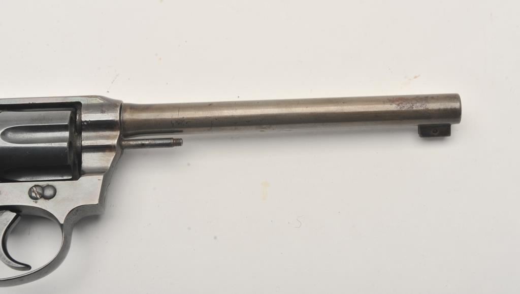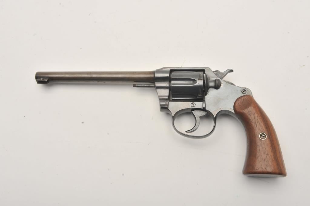 Colt New Police revolver, .32 caliber, Serial #94996. The pistol is sold as parts with a 6” barrel. The front sight is missing and the barrel has been over-rotated and installed incorrectly. The metal surfaces retain a significant amount of their blue finish with the barrel a grey patina. The smooth wood grips are in good condition. The bore is fair and the action is non-functioning. Est.: $50-$100. (C+R).
