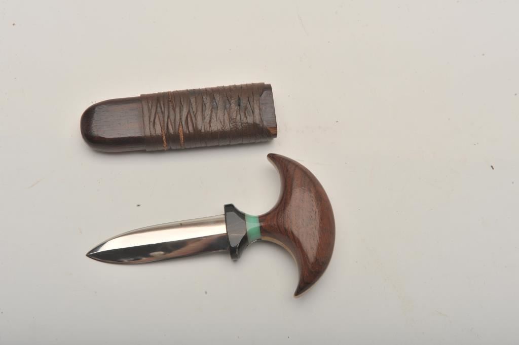 Custom Dave Murphy push dagger with leather wrapped wood sheath. The knife has an overall length of 4 ¾” with a 2 ¾” blade. The high polish blade is marked, “DAVE MURPHY BLADES Gresham, Oregon.” The smooth wood handle has exotic hardwood at the handguard, brass straps and a green stone insert. The sheath is wood with leather wrap. Est.: $100-$200.