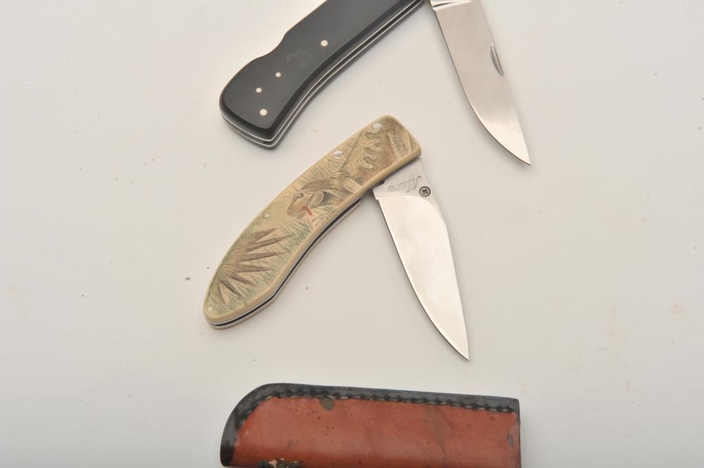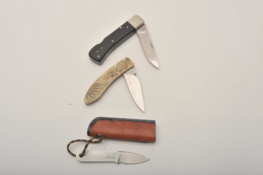 Lot of three knives, two folders and a fixed blade on a lanyard by Peter Marzitelli. The fixed blade knife is 4 ¼” long with a 1 ¾” blade, marked, “MARZ”, on a lanyard with a custom leather sheath. The first folder is 8 ¼” total length with a 3 ½” blade with smooth, pinned wood scales and stainless hardware. The second is 7” in length with a 3” blade with linen micarta scales and dinosaur artwork. Both knives are marked, “MARZ”. All three knives show little if any use and have not been sharpened. Est.: $150-$300.