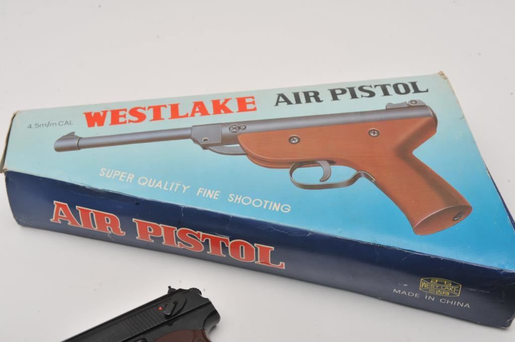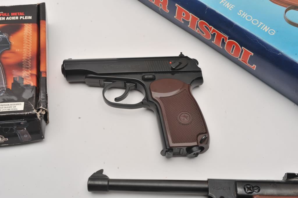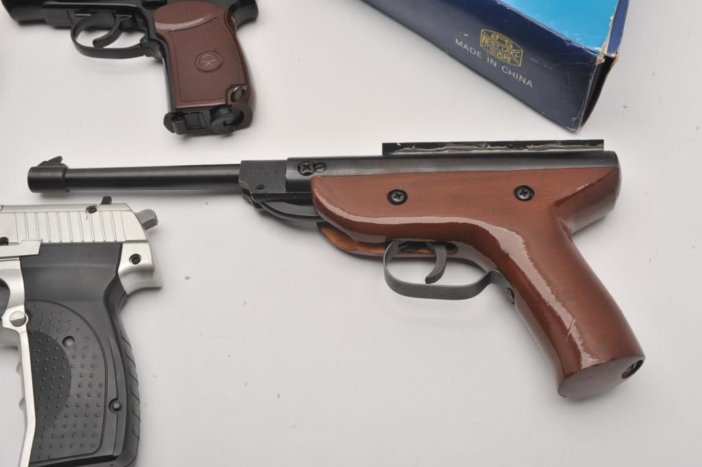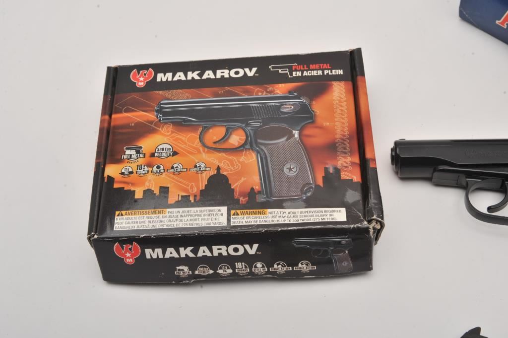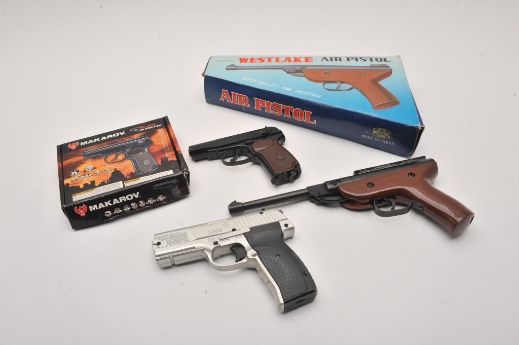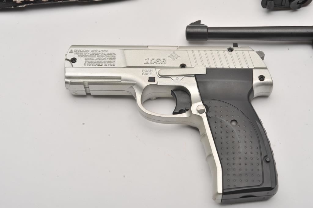 Lot of two Crosman CO2 air pistols. The first is a Crosman Model 112 .22 caliber pistol, Serial #251327 with an 8” barrel with the majority of the black finish still present. The checkered plastic grips are in good condition. The 2nd pistol is a Crosman Model 116 .22 caliber pistol, Serial #207093 with a 6” barrel with the majority of its black finish present. The checkered plastic grips are in good condition. Est.: $100-$200.