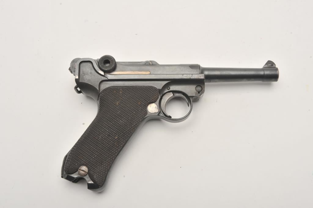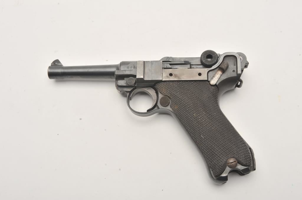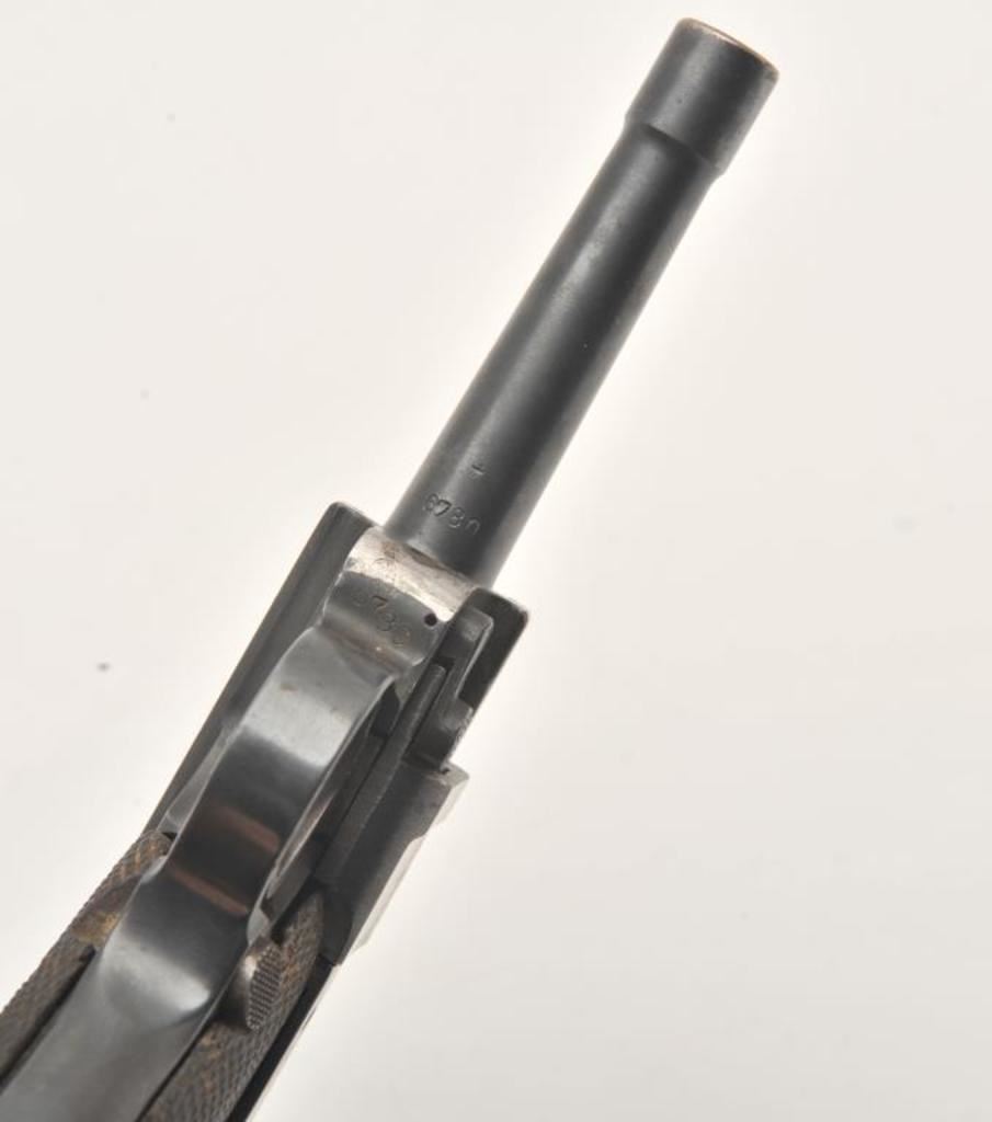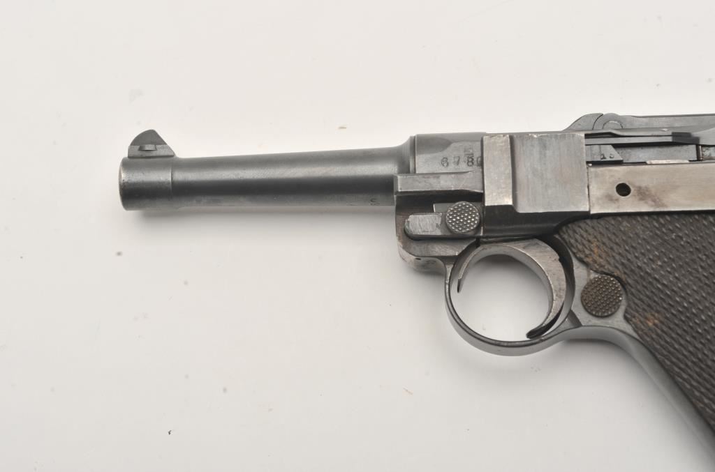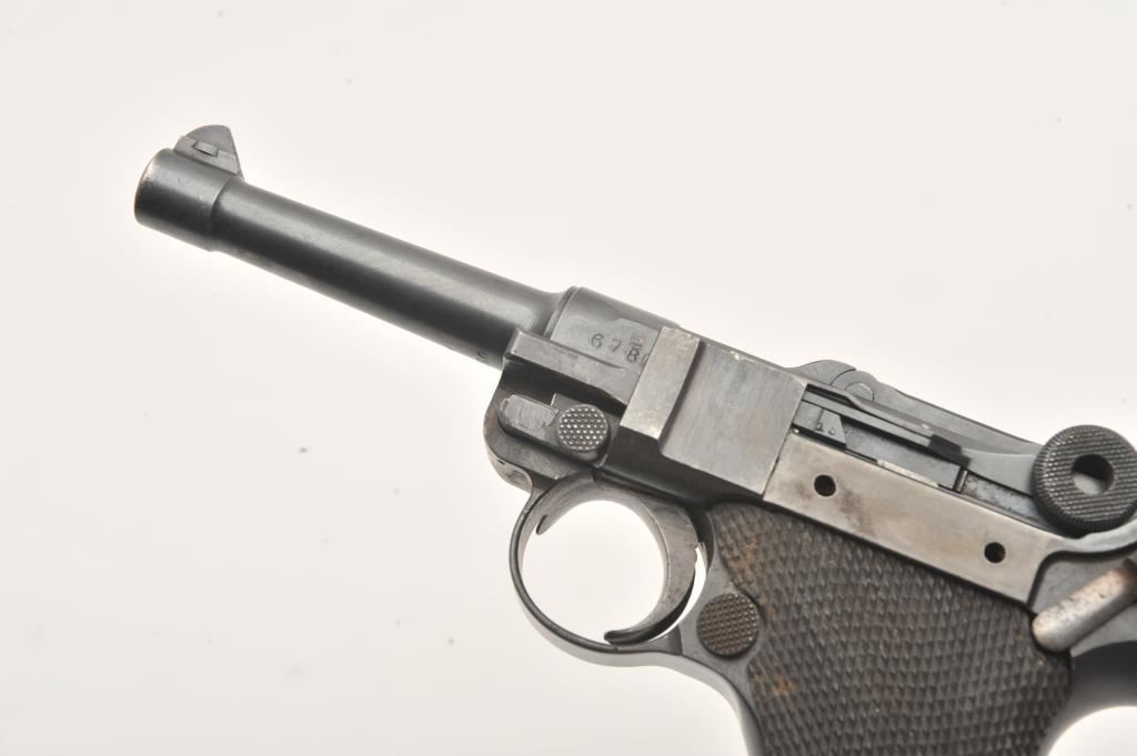 1918 DWM Luger semi-automatic pistol, 9mm caliber, Serial #6780. The pistol is in fair overall condition with a 4” barrel. The pistol is sold as parts with a non-functioning action and missing parts. The metal surfaces retain the majority of their blue finish with old toning straw finish. The checkered wood grips are in good condition with small mars and sharp checkering. The bore is fair, the action non-functioning and the markings are legible. The lot does not include a magazine. Est.: $100-$200. (C+R).