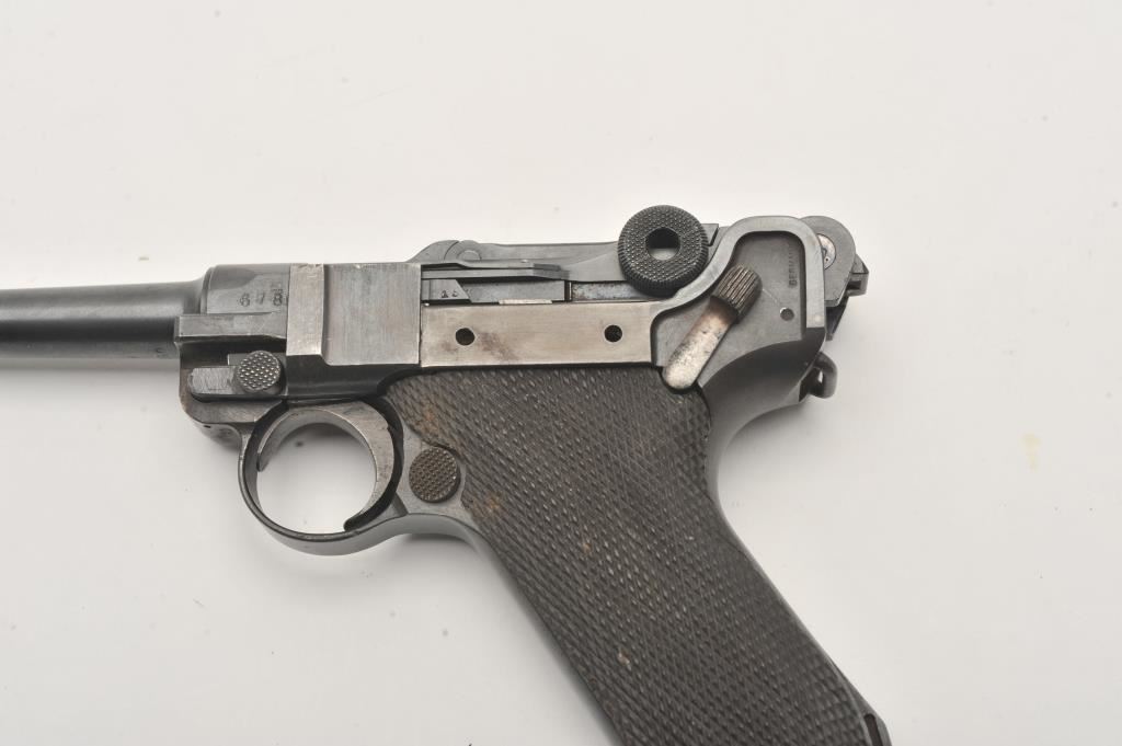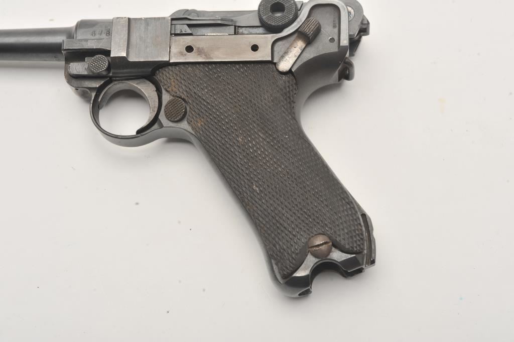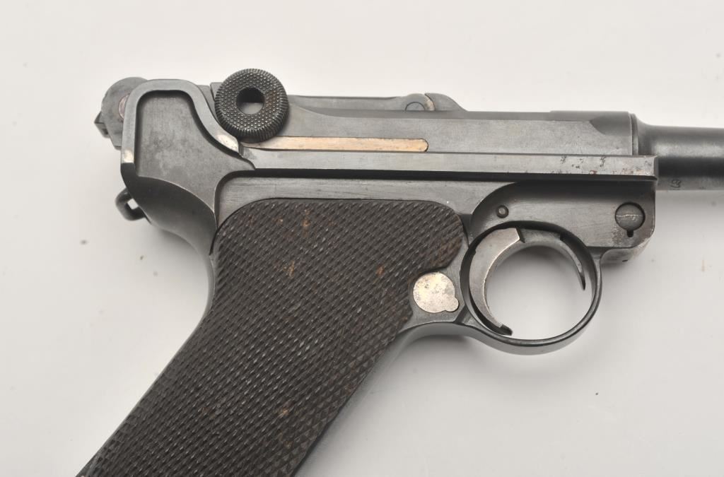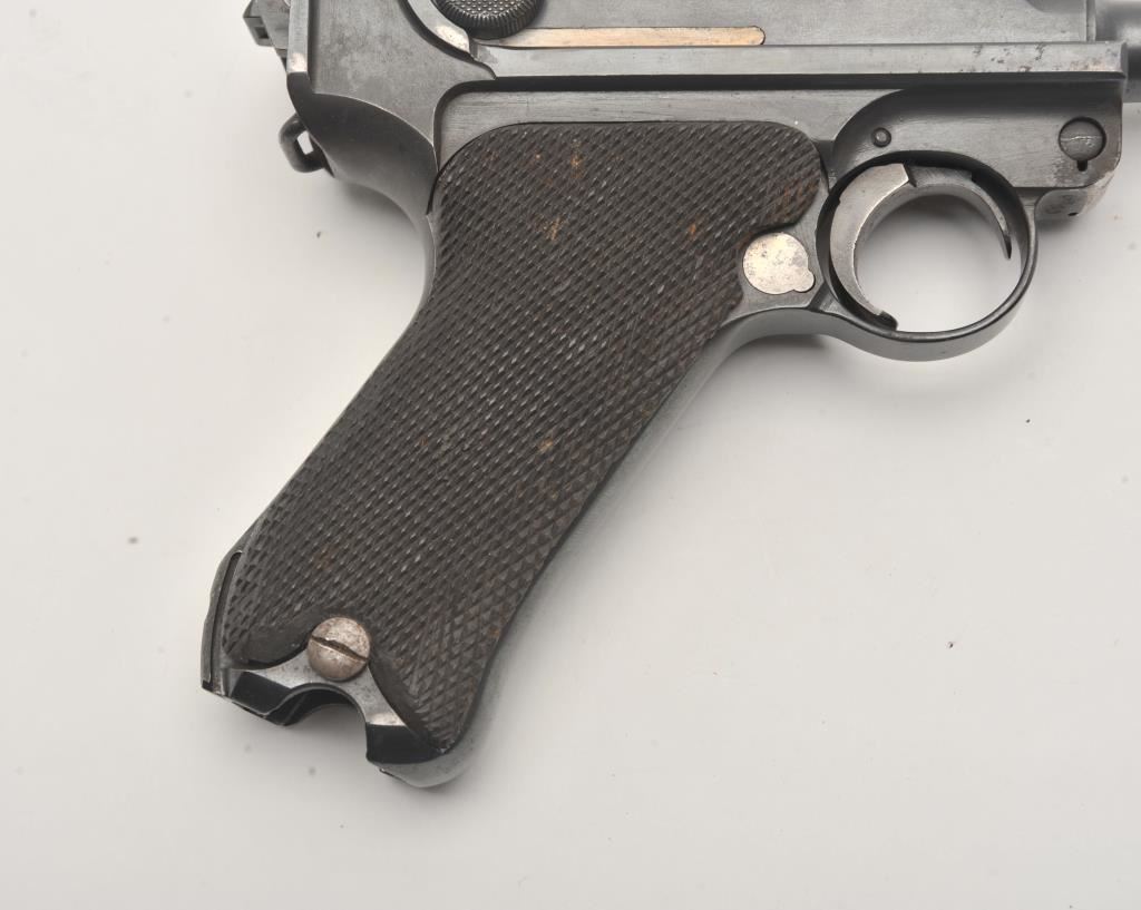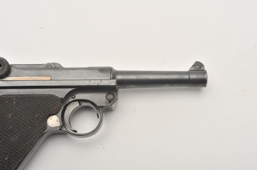 1918 DWM Luger semi-automatic pistol, 9mm caliber, Serial #6780. The pistol is in fair overall condition with a 4” barrel. The pistol is sold as parts with a non-functioning action and missing parts. The metal surfaces retain the majority of their blue finish with old toning straw finish. The checkered wood grips are in good condition with small mars and sharp checkering. The bore is fair, the action non-functioning and the markings are legible. The lot does not include a magazine. Est.: $100-$200. (C+R).