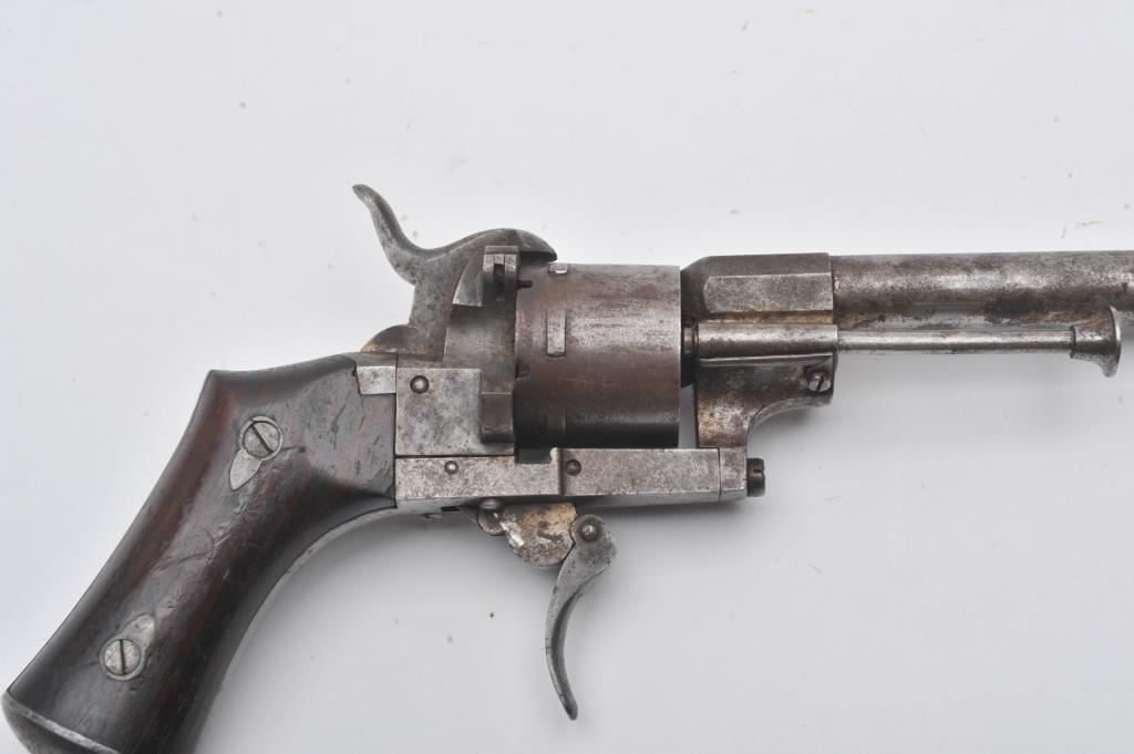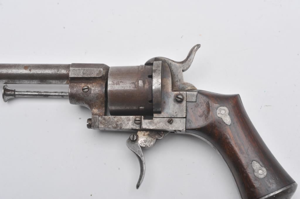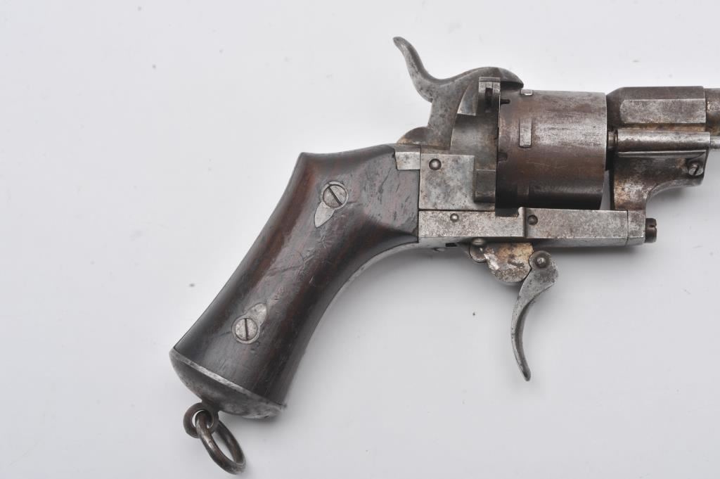 European folding trigger pinfire revolver, .38 cal., 6” barrel, front sight missing, wood grips, #NVSN. This gun is in un-cleaned good condition showing a grey patina with traces of original case colors on the frame, good action and bore, no markings; good grips. (Antique). Est.: $100-$200.