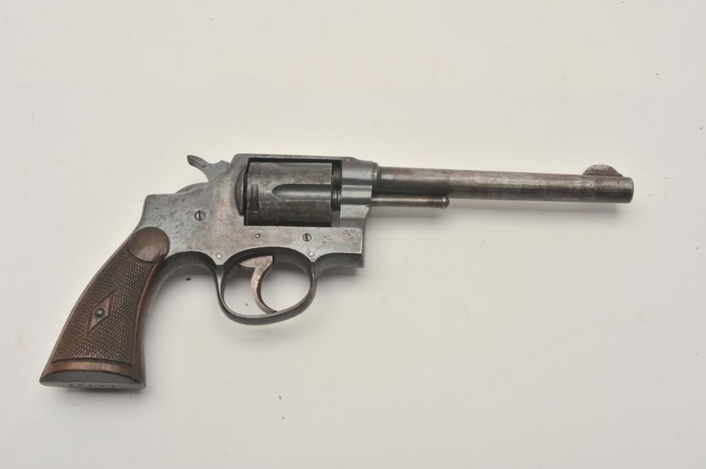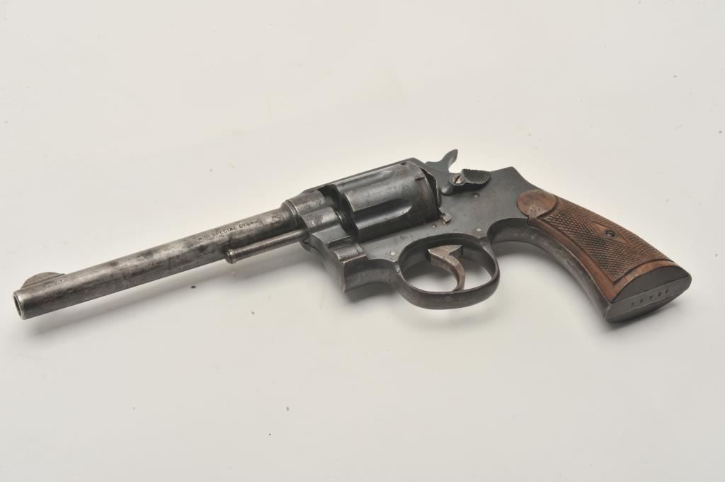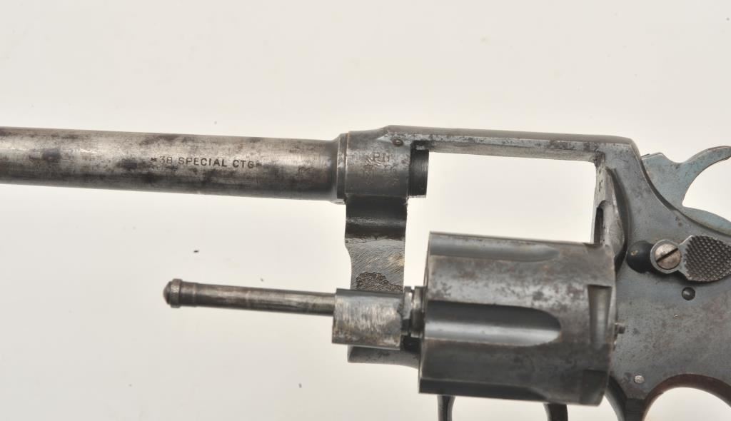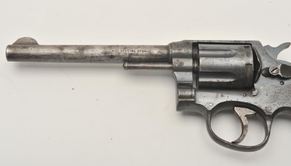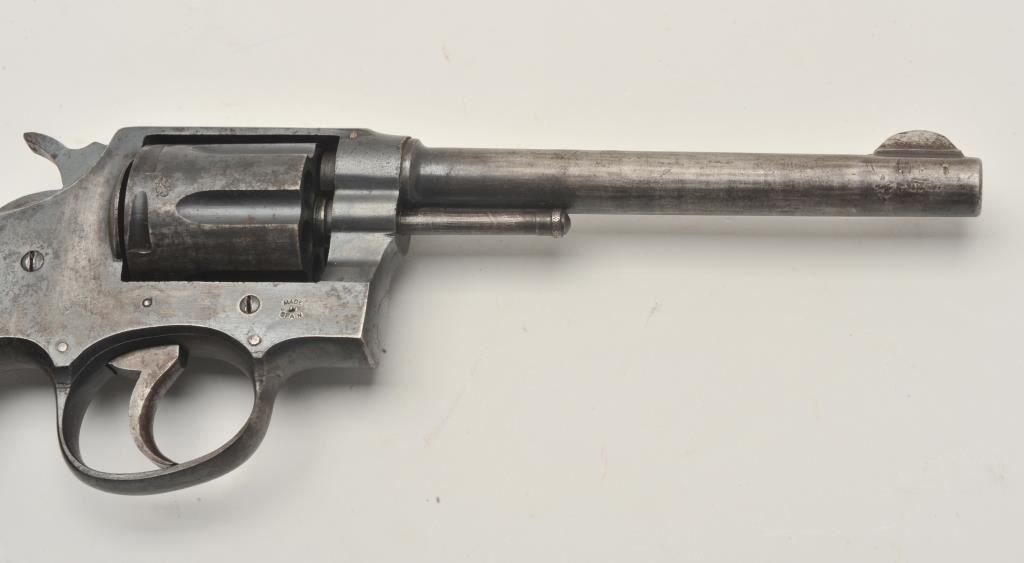 Eibar copy of a Smith & Wesson DA hand ejector revolver, .38 Special caliber, blued finish, checkered wood grips, S/N 32726, in overall fair + condition showing old cleaning to cylinder and barrel with scattered spots of erosion, working action, fair bore and markings; good grips. (Modern/no PPT). Est.: $75-$150.