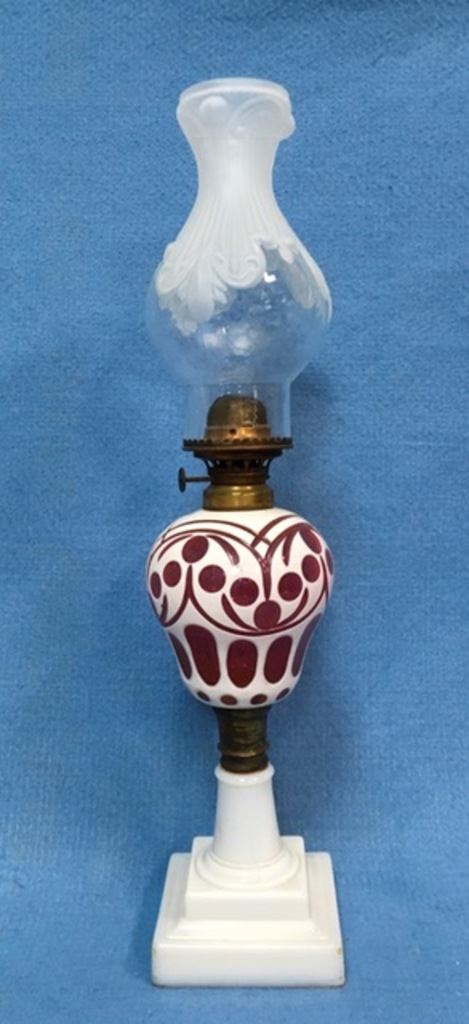 Victorian white cut to ruby overlay glass oil lamp attributed to Boston & Sandwich Glass Co. Circa 1880s. 21" tall including chimney. Est.:$200-$400.