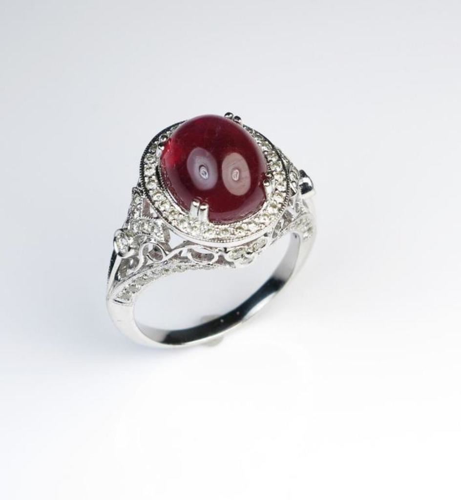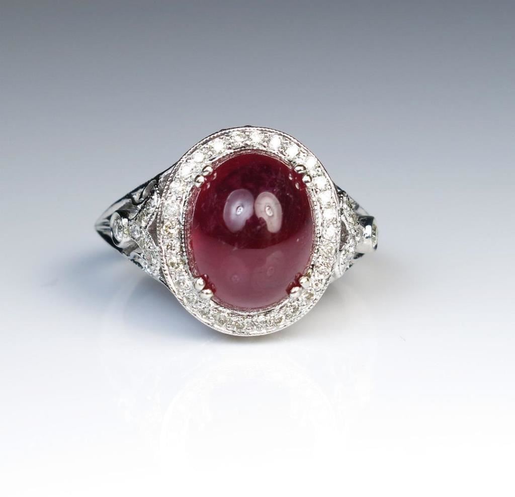 Fabulous 8.40 carat Ruby and Diamond Ring featuring a center Cabochon Ruby accented with over 82 round Diamonds weighing approx. 0.60 carats with H-I colors and SI clarity set in an intricately detailed 14 karat white gold vintage style setting. Retail $3,000-$4,000 Estimates $1,200-$1,800