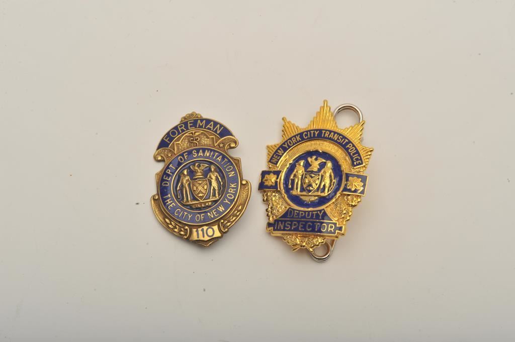 Lot of 2 badges including a New York City Transit Police Deputy Inspector cap badge and a New York City Dept. of Sanitation Foreman pin badge (“Johnson National/N.Y” hallmark.). Est.: $100-$200.