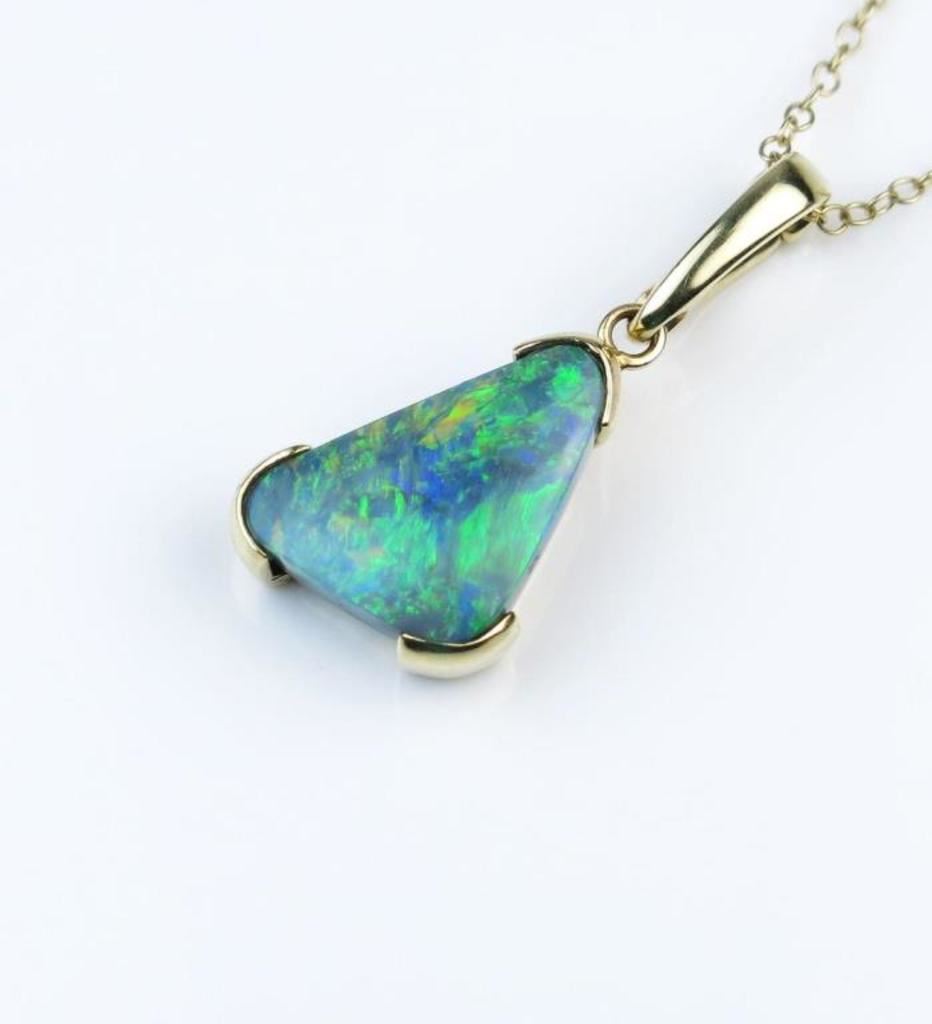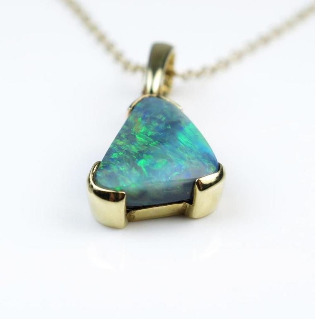 Exceptionally Fine Quality Australian Black Opal Pendant featuring a Black Opal with dramatic flashes of intense greens and blues with bits of orange. Opal weight approx. 7.00-8.00 carats set in a 14 karat yellow gold custom made setting. Fine Black Opals are becoming increasing rare and more costly to acquire, this is an investment piece. Retail $3,000-$4,000 Estimates $1,800-$2,500