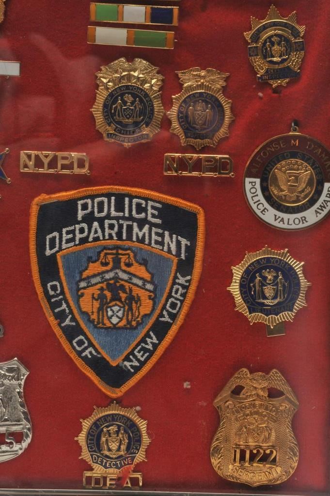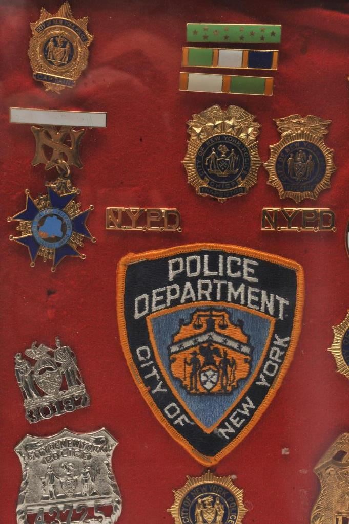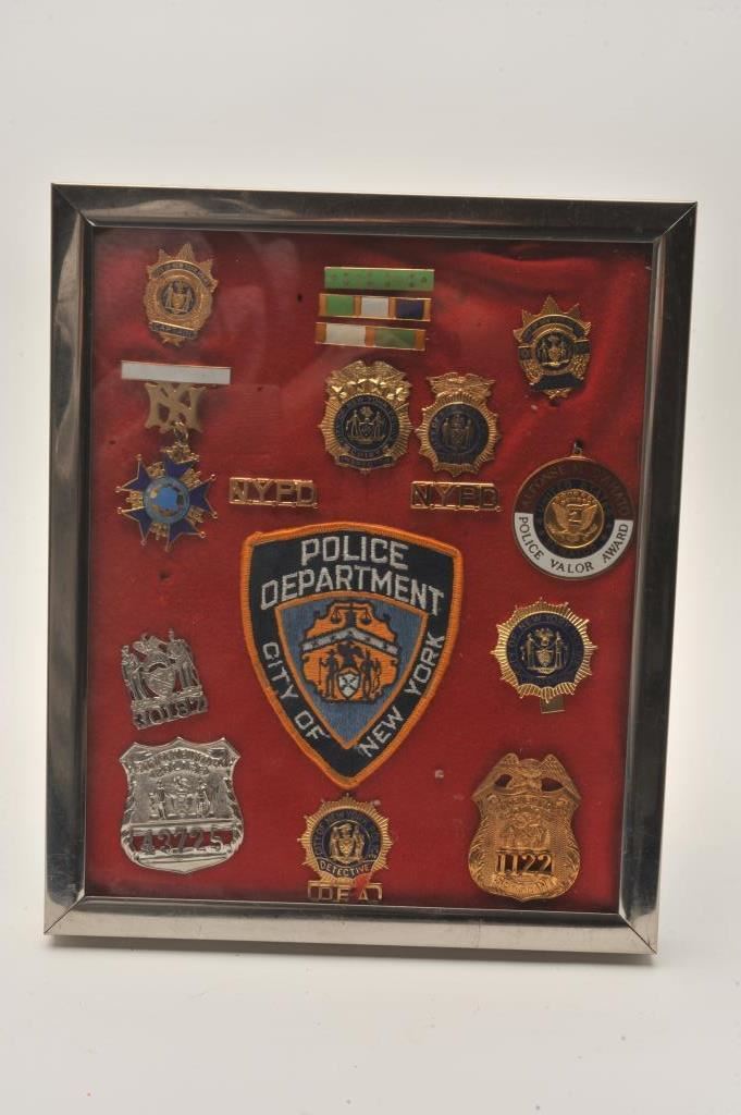 Framed New York Police badges, lapel pins, bars, awards and patch; 18 pieces total. Est.: $150-$300.