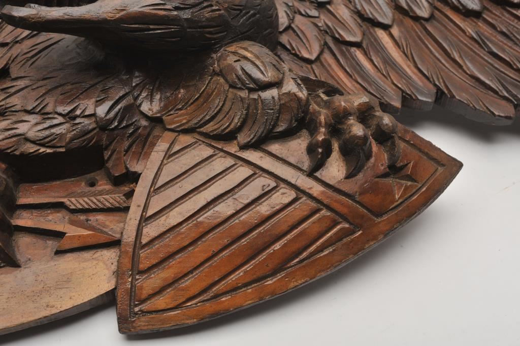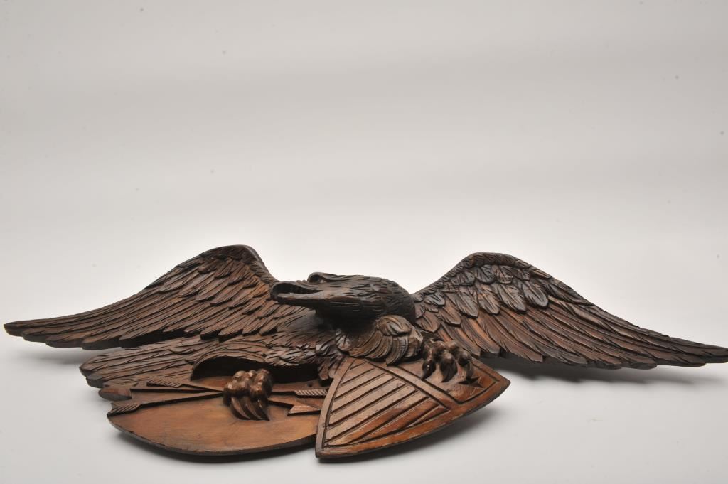 Mid 1860-1900 American carving of war eagle (clutching arrows) with Union Shield. Very well carved in relief. Approx. 44 1/2". From the Eric Vaule estate. Priced at $7500 in his sales room. Est. $1500-3000