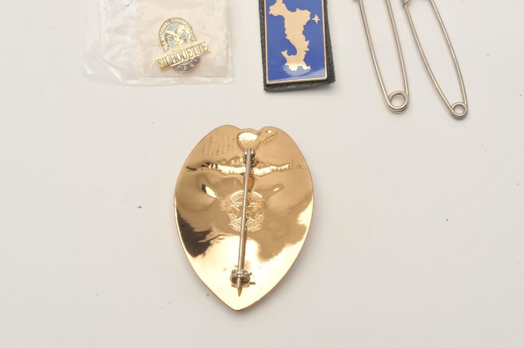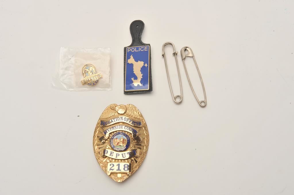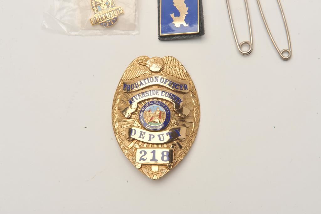 Lot including a Riverside County, CA Deputy Probation Officer badge (218/hallmark Custom Insignia, Phoenix, AZ), an enameled “POLICE” watch or key fob and a 1991NRA National Championship Silhouette commemorative pin. Est.: $150-$300.