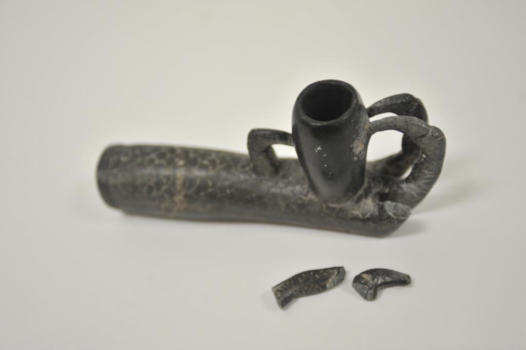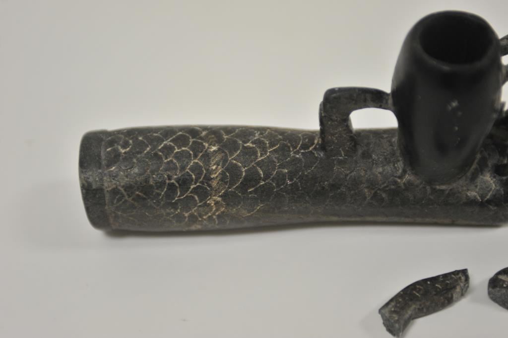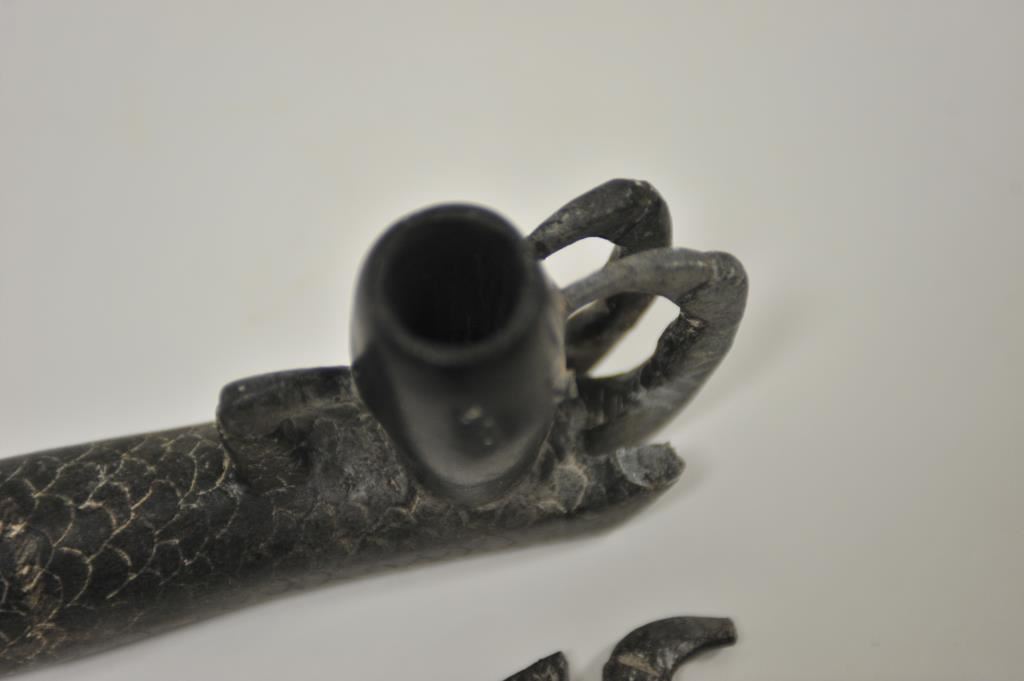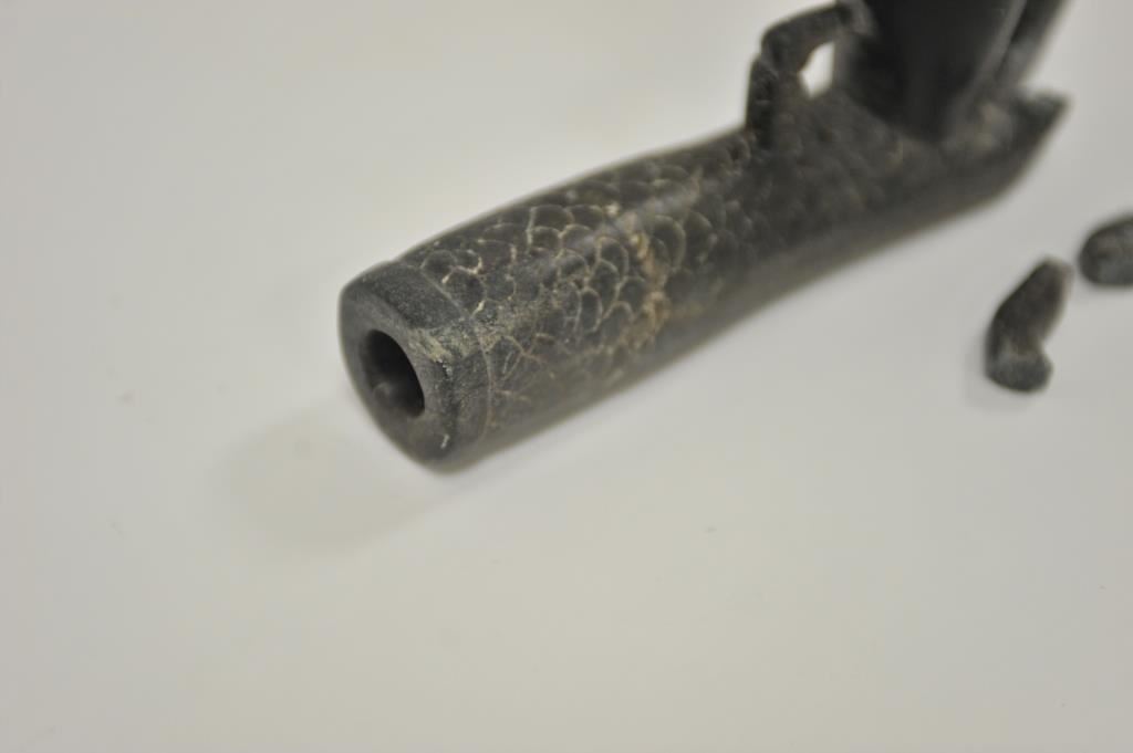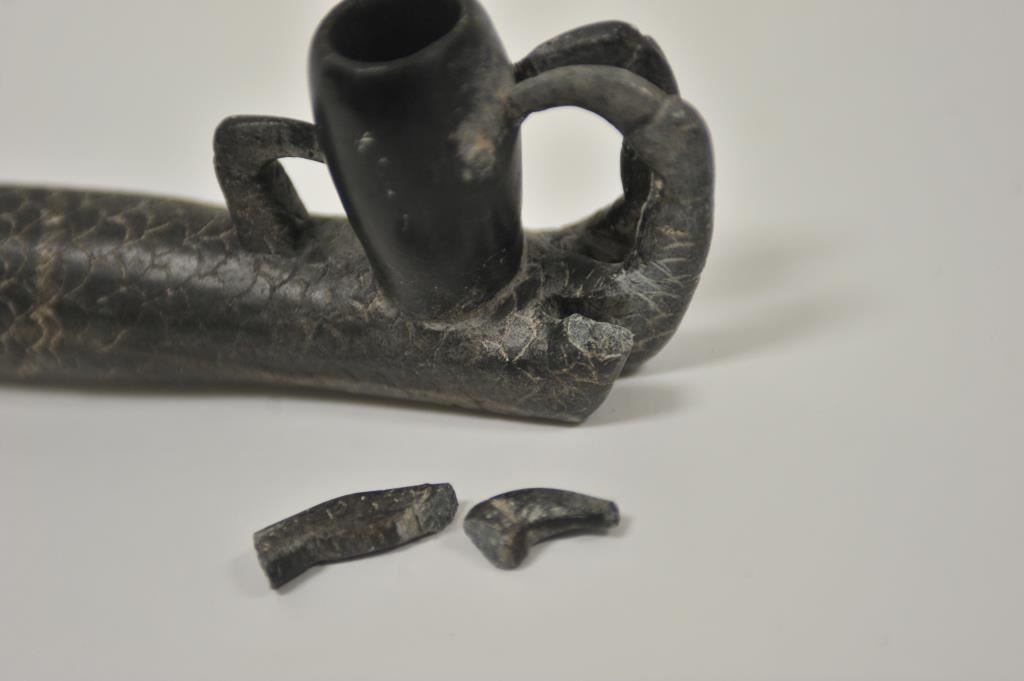 Stone eagle claw pipe; well carved; age unknown; appears antique (drilled off center-old method); some damage. Est.: $150-$300.