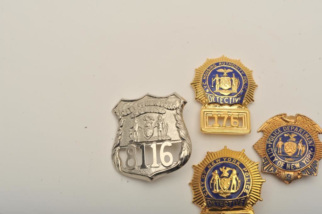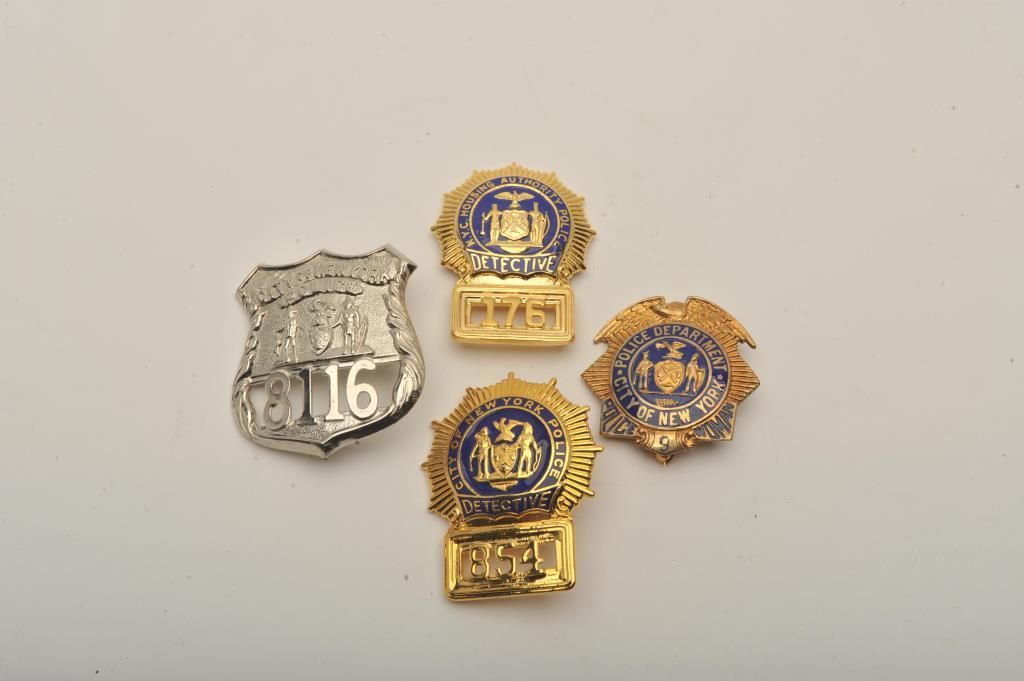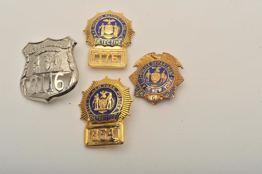 Lot of 4 badges including a N.Y.C. Housing Authority Police Detective pin shield badge #176, a City of New York Police Dept. Police Woman pin shield badge #9, a City of New York Police Detective cap badge #854 and a City of New York Police cap badge #8116. Est.: $200-$400.