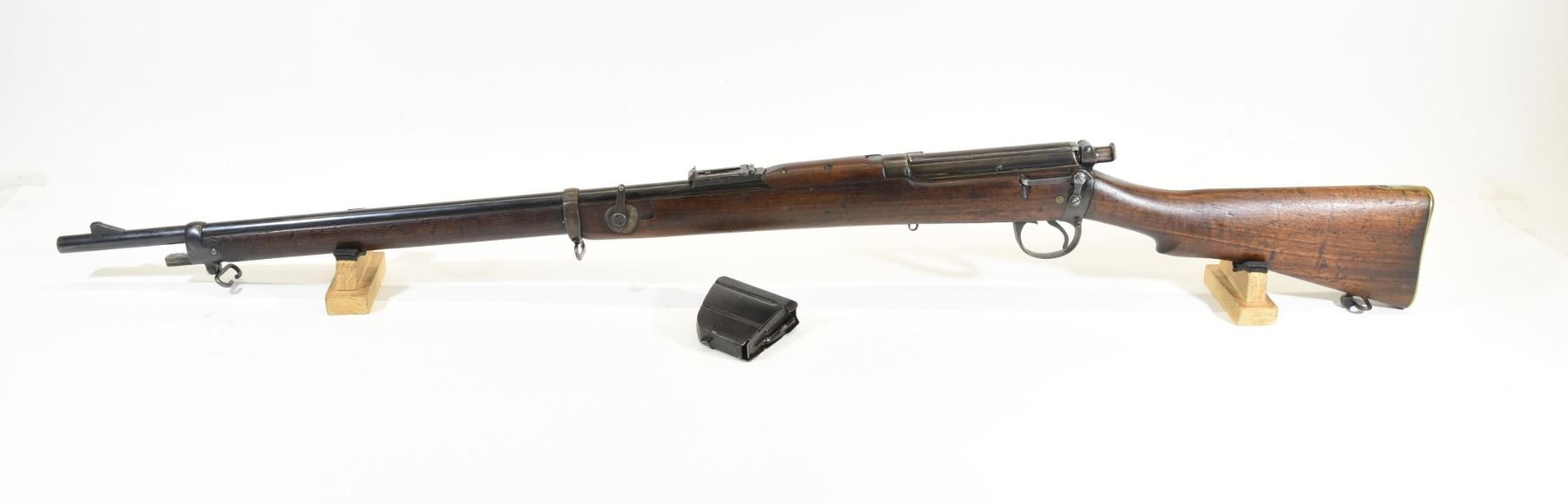 Non-restricted, bolt action, 303 British, 30" barrel, SN 5757. Wood has numerous dents, marks and scratches, bluing is mostly brown, bore is stained, rifling prominent. Has volley sights and mag cut off. Stamped M&D,
