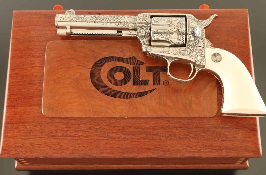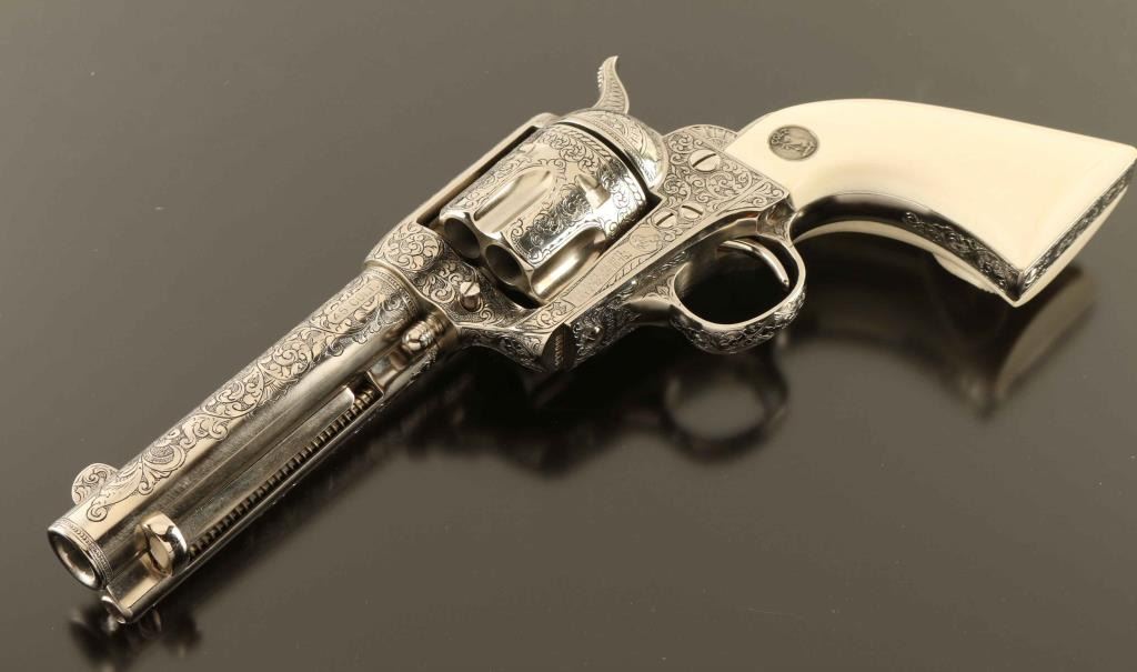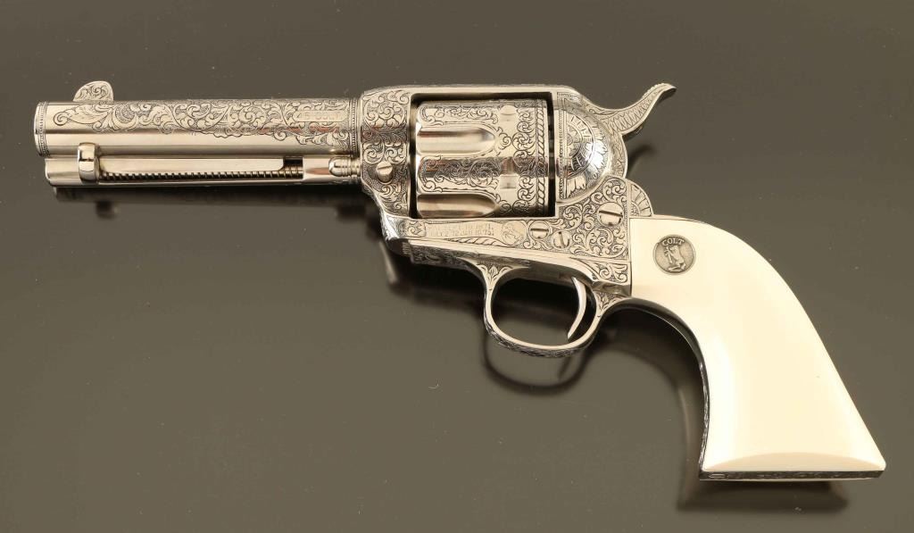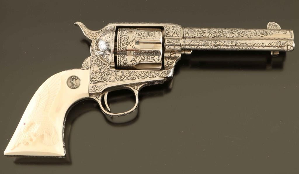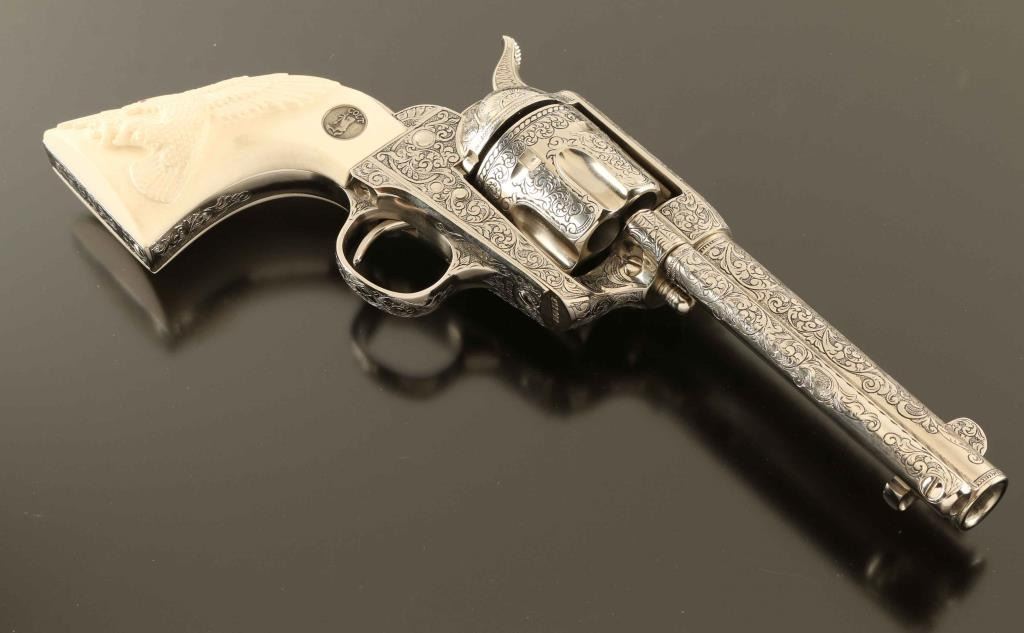 Gorgeous 1902 vintage first generation single action revolver finely engraved by Jerome Harper and embellished with an antique ivory single-piece grip that features a embossed relief carved eagle on the right side with ruby eye. 4 3/4" bbl with two line address, full coverage New York style engraving with signature on the rear cylinder face, all matching serial numbers and medallion ivory grip. Includes a hand crafted wood display case with velvet lined interior and "Colt" engraved lid. Revolver exhibits nearly all of it's nickel plated refinish showing little to no visible wear. Action is smooth with four clicks, the bore is excellent, marking are very good and the antique ivory grips are fine. Condition is NRA Excellent as restored. ***C&R Firearm***
