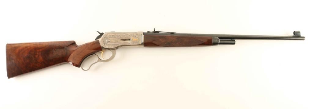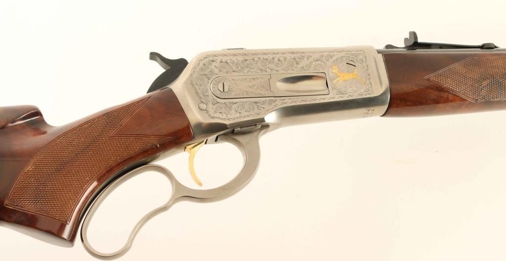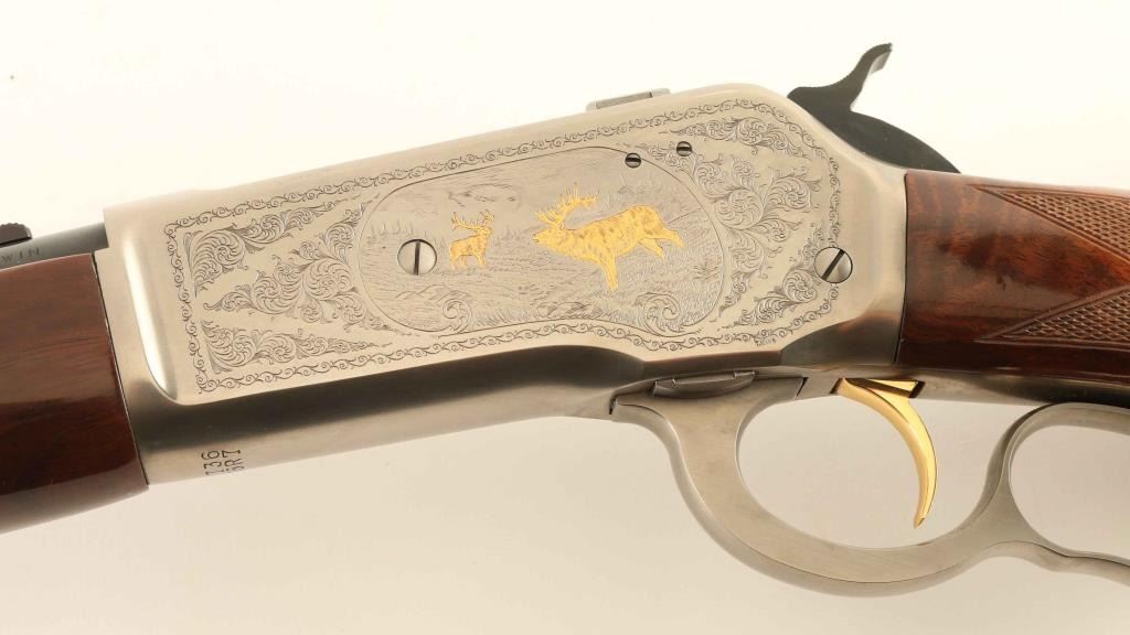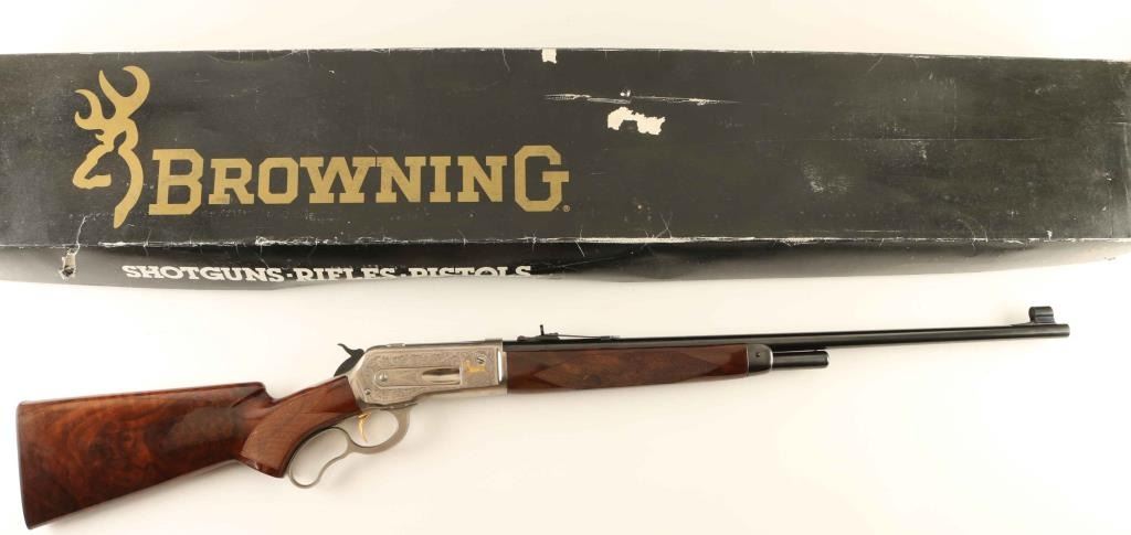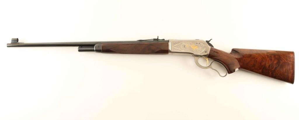 SN: 01736PR6R7 Embellished high quality reproduction of the Winchester Model 71 chambered in .348 Winchester. Manufactured in Japan by Miroku circa 1876 with only 3,000 produced in this configuration. Features a blued 24" round barrel, T. Naka signed scroll engraved greyed receiver with gold accented elk & deer game scenes, ramped & hooded blade front sight with bead top, semi-buckhorn adjustable rear sporting sight, 4-round tube magazine, smooth gold trigger, serrated hammer spur, curved finger lever, checkered walnut semi-beavertail forend with high gloss finish, pistol grip shoulder stock with knurled metal buttplate. Includes the original factory cardboard box. Rifle exhibits approximately 98% of it's original finish showing little to no visible wear with a small amount of oxidation/light surface rust observed on the upper tang & barrel. Action is smooth, the bore appears excellent and the glossy wood stocks are near fine with only minor blemishes. Condition is near NRA Very Good in box. ***Modern Firearm***