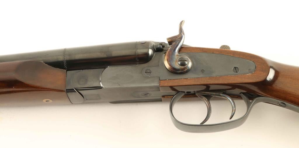 Double barrel side by side shotgun. 100% blued finish, with laminated wood stock, and forearm. 26" barrels. Case hardened hammers, and lever. Exposed firing pins. Bore is excellent/bright. Action is tight, and barrels lock up tight. Double triggers. Black nylon sling attached. A fine conditioned shotgun. NRA condition-Excellent, plus Modern Firearm.