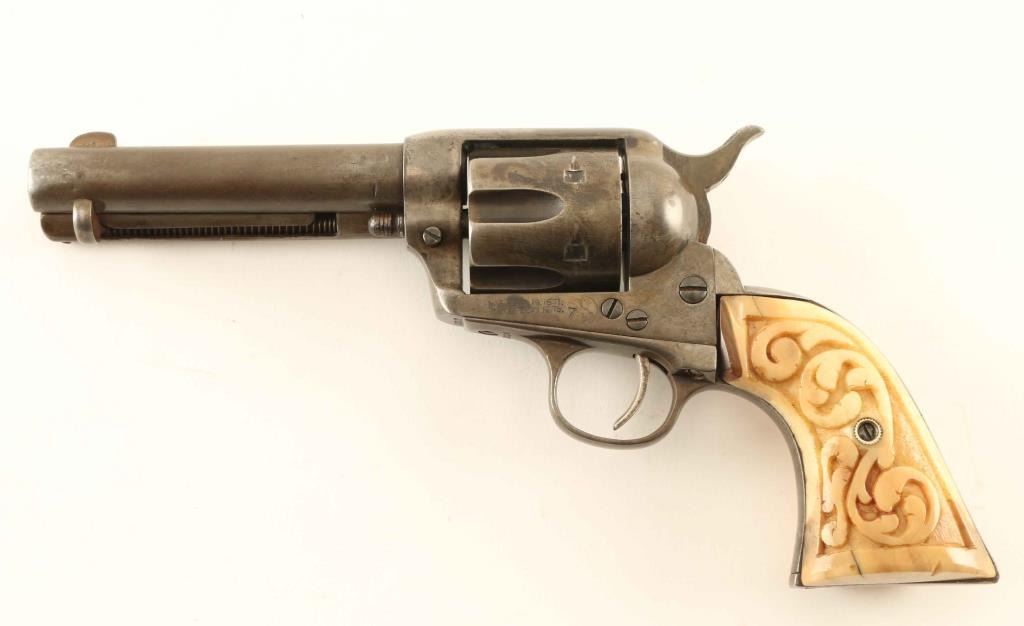 Vintage American made single action six-shot revolver chambered in .45 Colt, manufactured circa 1902. Features a blued & case hardened finish, 4 ¾” barrel with two-line address, shortened blade front sight, ‘v’ notched rear sight, smooth thin trigger, knurled hammer spur, fluted cylinder, ejector rod and two-piece cow horn grips with relief carved floral scroll. The frame is stamped “101” on the right side and “7” stamped on both sides. Serial numbers match on the frame, trigger guard and backstrap. Revolver exhibits heavy holster wear with the majority of the metal surfaces displaying a smooth aged brown patina with traces of an old refinish in the protected areas. Action is crisp with a hair trigger & only one discernable click, the bore shows scattered pitting throughout, markings are good and the carved grips are good as slightly ill-fitting & a couple small losses in the left panel as well as a single notch. Condition is NRA Good. ***C&R Firearm***