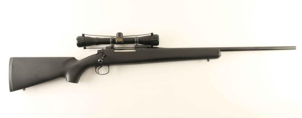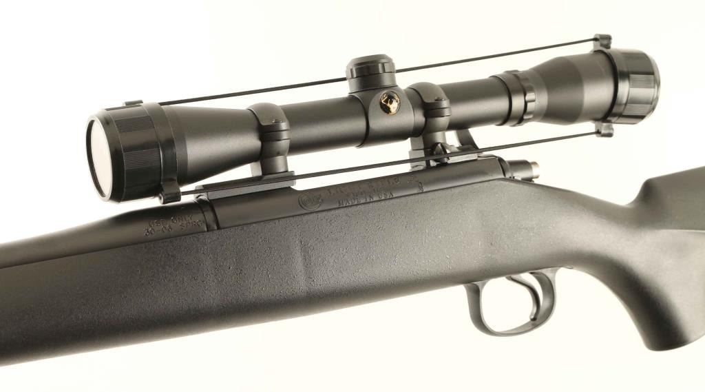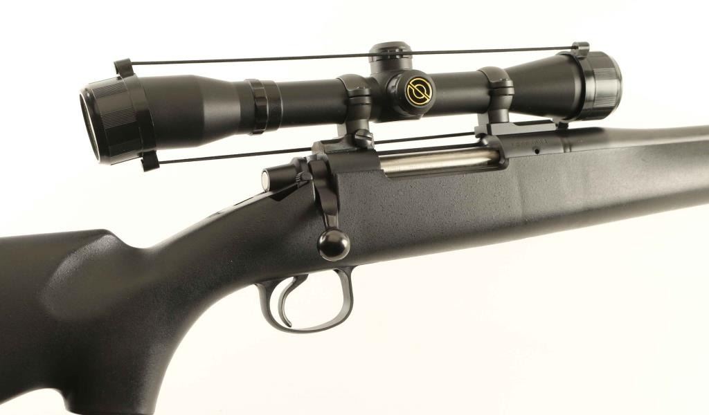 Bolt action rifle. 100% blued finish. Black synthetic stock, cheek piece, pistol grip style. 23 1/2" barrel. Bore is excellent/bright. Action is smooth/tight. Stock has recoil pd, and sling swivel studs.. Mounted with Simmons 4x32 scope. There is a slight spot of surface rust on the rear scope mount, otherwise an new conditioned rifle. NRA-Conditon-Excellent. Modern Firearm.
