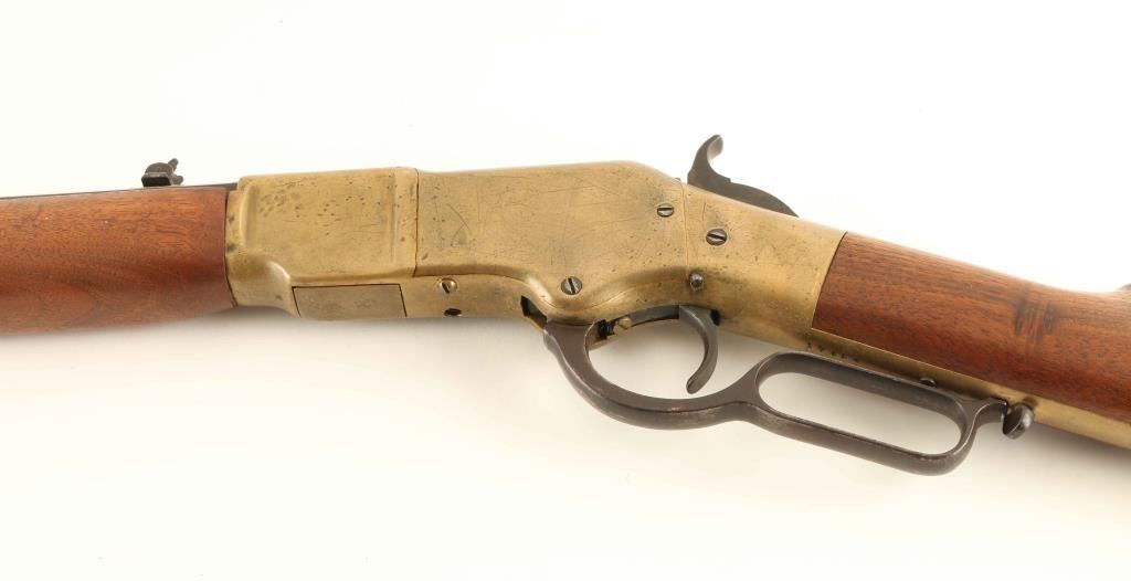 'Third Model, Yellow Boy' Desirable early brass frame lever action repeating rifle chambered in .44 Rimfire, manufactured circa 1868. The iconic 1866 was the first firearm to bear the Winchester name, it was produced in three different variations(carbine, rifle & musket), went through four model changes and production lasted from 1866-1898 with an estimated 170,101 rifles produced. The estimated number of Sporting Rifle configuration rifle produced is only 28,000, a mere 16.46% of the total production. This rifle features a 24 3/8" octagon barrel, full-length 17 round tubular magazine, dovetailed brass blade front sight, flip-up "L" shape dual leaf rear sight, brass frame, smooth trigger, knurled hammer spur, scalloped loading gate, smooth walnut semi-beavertail forend with brass cap and a straight grip shoulder stock with brass crescent buttplate. Includes a tooled brown leather rifle scabbard by Dave Shelley of Cody, Wyoming. The barrel is stamped "WINCHESTER'S-REPEATING-ARMS. NEW HAVEN. CT./KING'S-IMPROVEMENT-PATENTED-MARCH 29. 1866. OCTOBER 16. 1860" with the right edge marking 2" away from the receiver. The rifle displays an even dark brown patina on the barrel, a mottled brown patina on the magazine tube, a nicely aged brass patina on the receiver which shows scattered dings & soft edges. The action appears to be is in working order other that the lifter not traveling fully upward, the bore is good, the markings are very faint, and the wood later stocks are near fine. Condition is NRA Good. ***Antique Firearm***