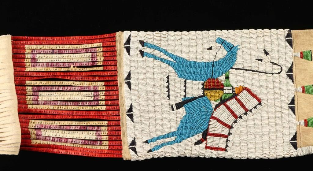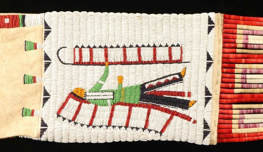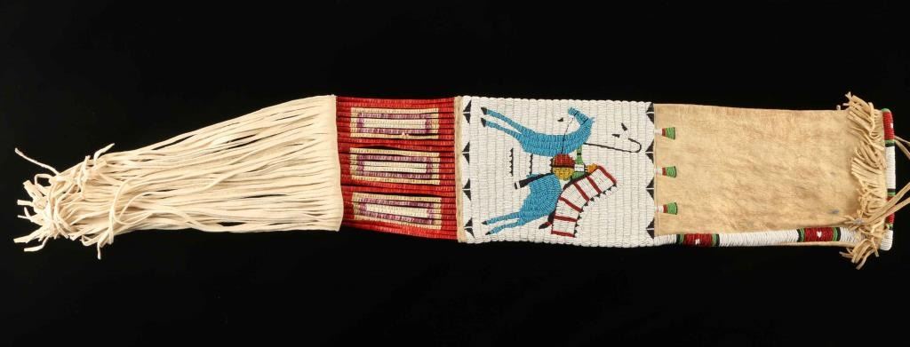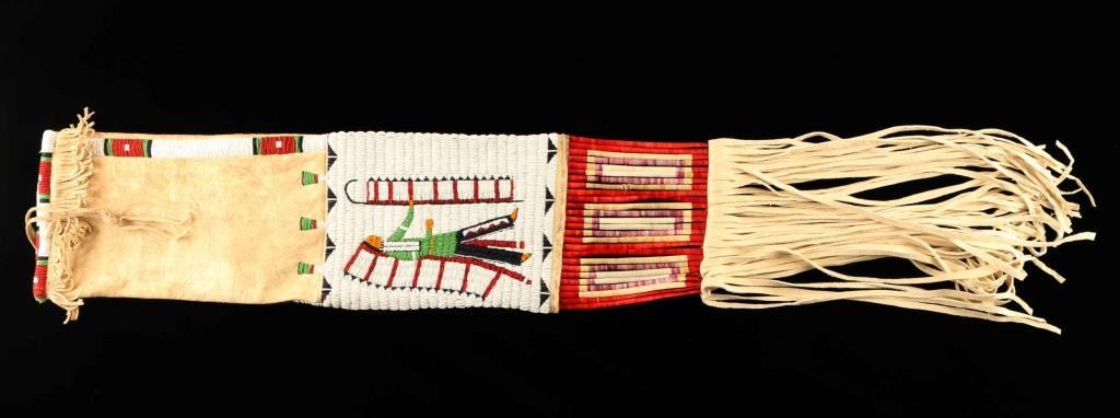 Tanned leather bag with beaded chief on horse back with headdress, other side chief is standing with his staff, beaded geometric design on sides, quilled drop in red ,purple and white with fringe. Overall excellent condition.