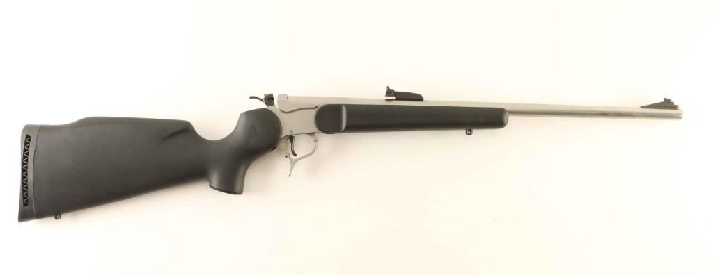 Break-top single-shot rifle. Stainless steel, Black synthetic stock and forearm. 21" barrel, adjustable rear sight, recoil pad. and sling swivel studs. Barrel drilled and tapped for mounting scope rail. Bore appears excellent, but a little dirty. safety is located on the hammer. A very nice rifle that appears to be in almost new condition. NRA condition-Excellent. Modern Firearm.