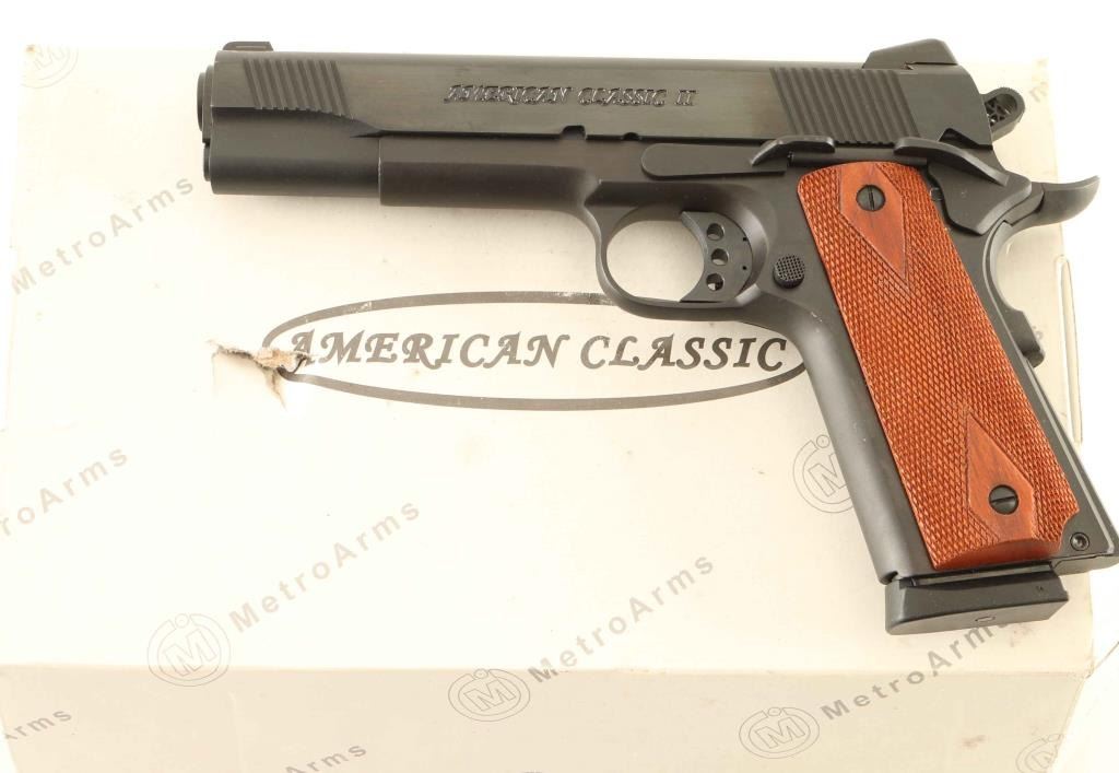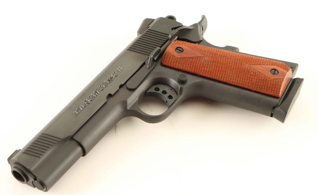 Semi-automatic pistol. 98% blued finish, with checkered/diamond wood grips. Classic M1911 style. 5" barrel. 3-dot sights, with adjustable rear sights. Bore is excellent/bright. Action is tight. Comes with one 7-rd magazine. Comes in the original factory box, with manual, and trigger lock. A couple of very minor scratches on the metal, otherwise, a like new conditioned pistol NRA Condition-Excellent. Modern Firearm.