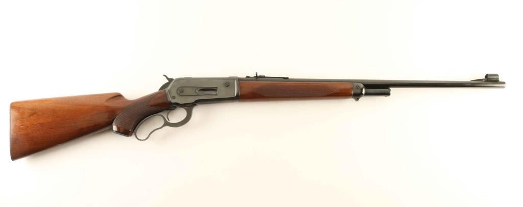 'Deluxe' Vintage lever action repeating rifle chambered in .348 Winchester, manufactured circa 1956. Features a blued finish, 24" round barrel, 2/3 length tube magazine, ramped & hooded blade front sight with bead top, semi-buckhorn adjustable rear sporting sight, smooth trigger, serrated hammer spur, curved finger lever, factory drilled & tapped receiver for a side mounted sight, checkered walnut beavertail forend, metal forend cap with provision for a sling swivel, and pistol grip shoulder stock with factory hard rubber grip cap & knurled metal shotgun buttplate. Rifle retains approximately 98% of it's original blued finish showing some scattered superficial scratches, a small scrape behind the hammer and a small amount of light surface rust observed on the forend cap & upper tang. Action is smooth, the bore is pristine, markings are sharp and the wood stocks are very good with some blemishes & what appears to be a 1/2" hairline crack on the right side of the wrist. Condition is near NRA Very Good. ***C&R Firearm***