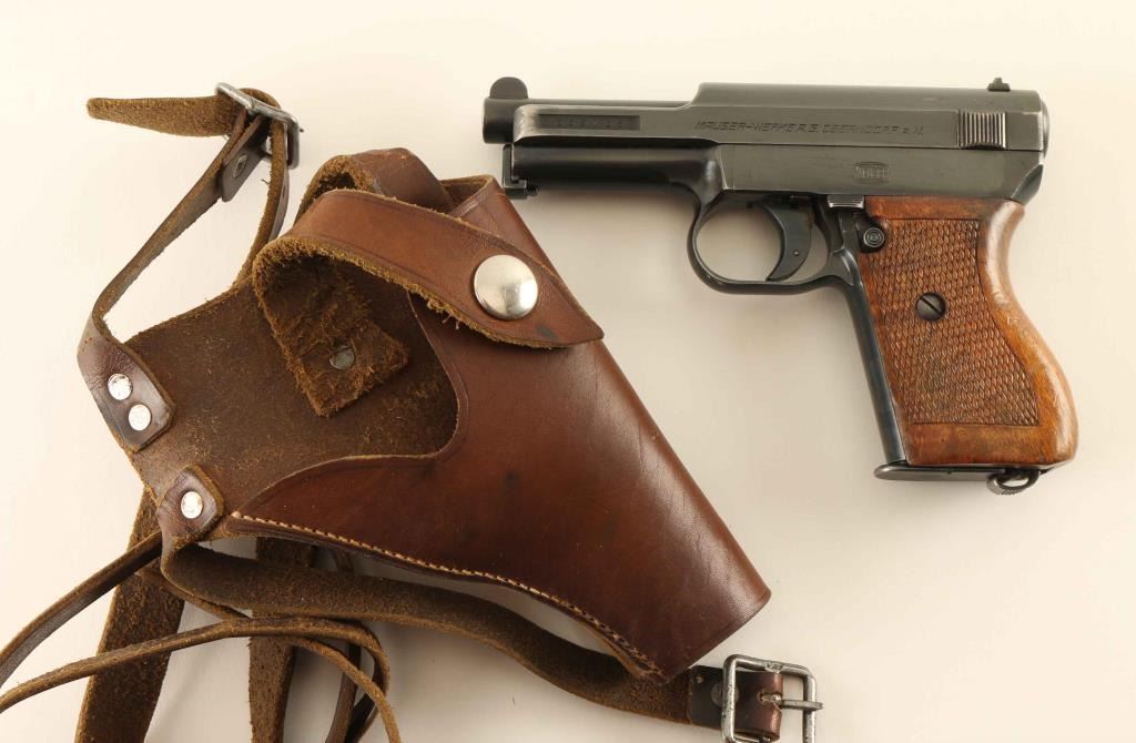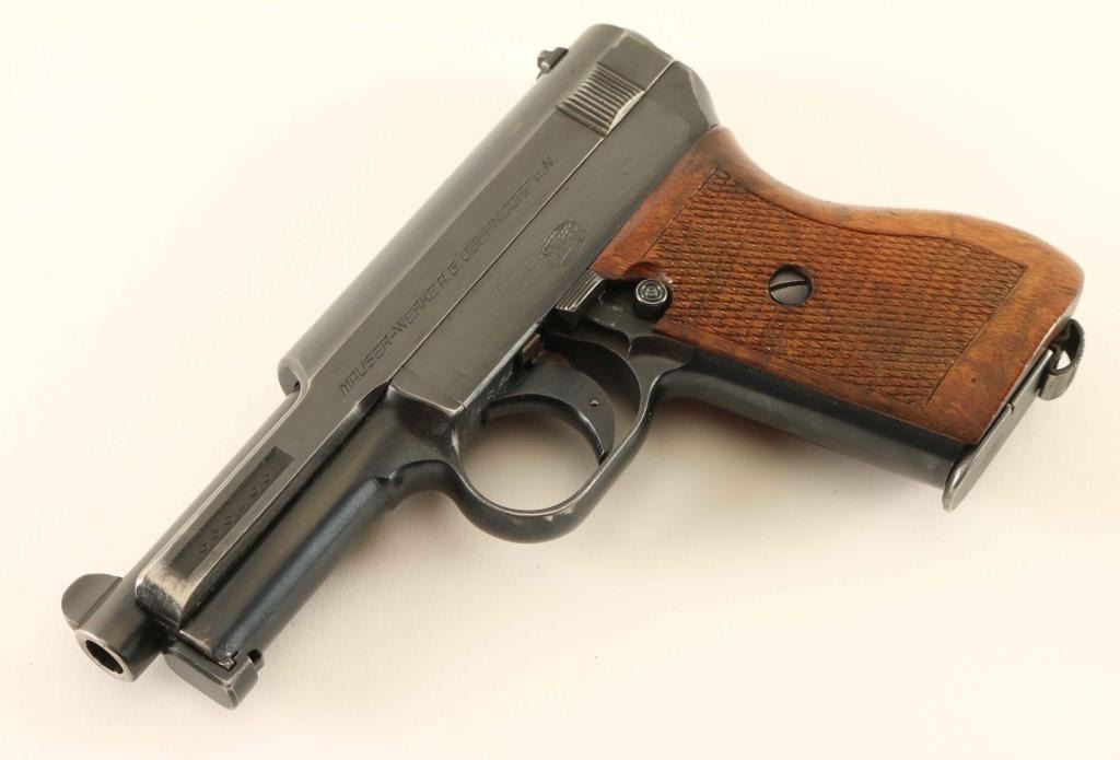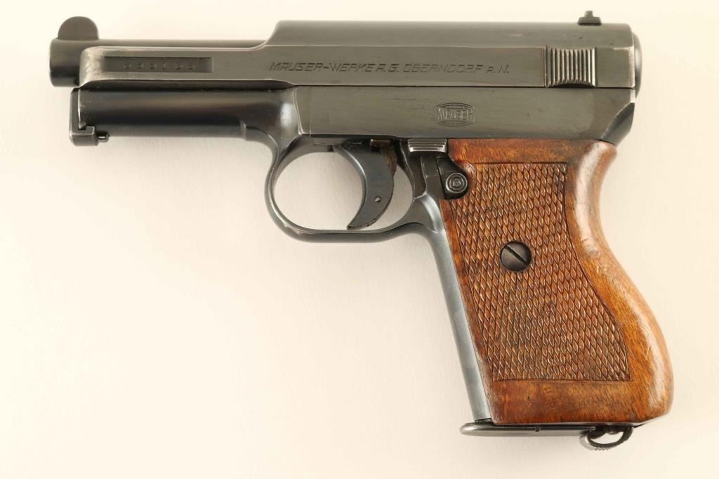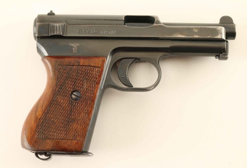 'Sixth Variation 1914' Nazi Navy marked striker fired semi-automatic compact pistol chambered in .32 Auto, manufactured circa 1934-1939. Features a blued finish, 3.4" barrel, round blade front sight, dovetailed rear sight with 'u' notch, smooth trigger, cocked indicator, thumb safety on the left side of the frame with a push button release, heel magazine release, factory 8 round magazine, bulged cocking serrations on the slide, steel frame and one-piece checkered walnut wrap-around grip. All observed serial numbers are matching. Markings: Slide - "MAUSER-WERKE A.G. OBERNDORF A.N.", "Cal. 7,65 D.R.P.u.A.P." & [Crown]/"U" proof. Side Plate - Mauser banner. Frame - [Eagle]/[Swastika]/"M" and Barrel - [Crown]/"U" proof. Includes a smooth brown leather shoulder holster. Pistol exhibits approximately 85% of what appear to be it's original bright blued finish showing holster wear, scattered scratches and a small amount of minor surface rust. Action is sound, the bore is excellent, markings are sharp, and the wood grip is very good. Condition is near NRA Very Good. ***C&R Firearm***
