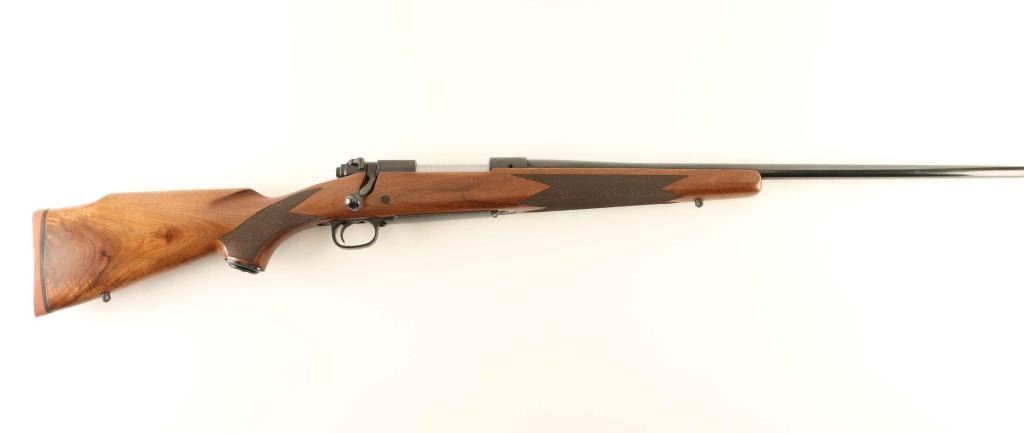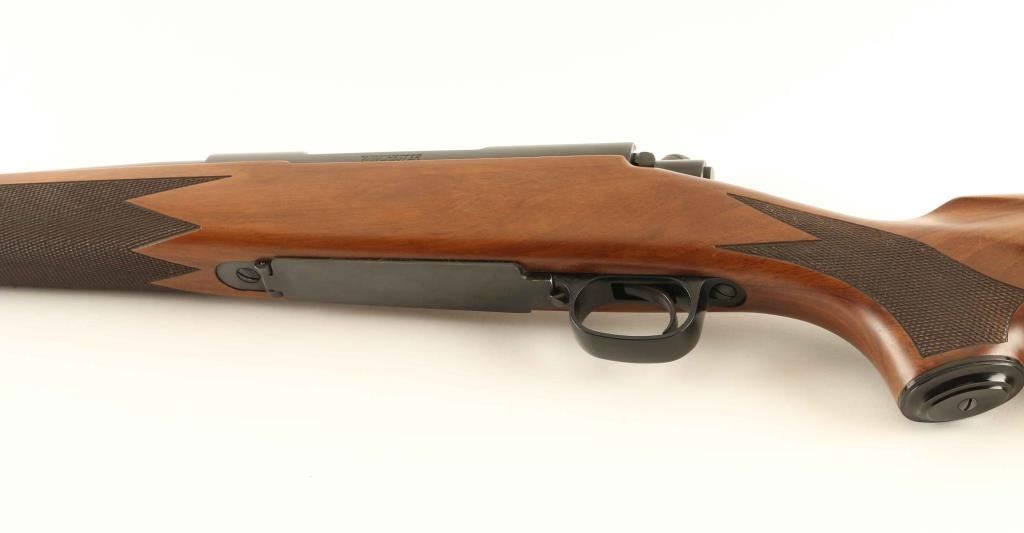 'Sporter' Push feed bolt action sporting rifle, manufactured circa 1988. Features a polished blued finish, 24" tapered barrel with no provisions for sights, drilled & tapped receiver, wide serrated trigger, jeweled bolt with three position safety on the rear, internal box magazine with hinged floorplate, and checkered walnut pistol grip shoulder stock with swivel studs, right handed cheek rest, black grip cap & red factory recoil pad. Rifle approximately 97% of it's original blued finish showing light handling marks with a few small bright scratches and a single small ding in the barrel. Includes the original factory cardboard box with documents. Action is smooth, the bore is excellent and the wood stock is fine. Condition is near NRA Excellent in box. ***Modern Firearm***