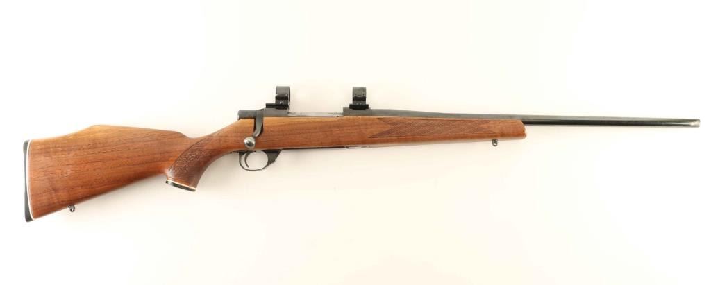 Bolt action sporting rifle built in Japan by Howa to Smith & Wesson specifications. Blued finish, 22" tapered barrel with no provisions for sights, installed two-piece scope base with Weaver rings, jeweled bolt, manual safety on the right side of the receiver, serrated trigger, internal box magazine with hinged floorplate, and skip-line checkered Monte Carlo style walnut stock with S&W marked grip cap, swivel studs & S&W marked buttplate. Rifle exhibits approximately 88% of it's original blued finish showing edge wear, a very small amount of surface rust where the barrel & receiver meet, muzzle wear with a few dings on the outside of the crown and scattered handling marks/scratches primarily on the barrel forward of the stock. Action is smooth, the bore shows bright lands with dark grooves and the refinished wood stock is good with the checkering worn semi-smooth. Condition is NRA Good. ***Modern Firearm***