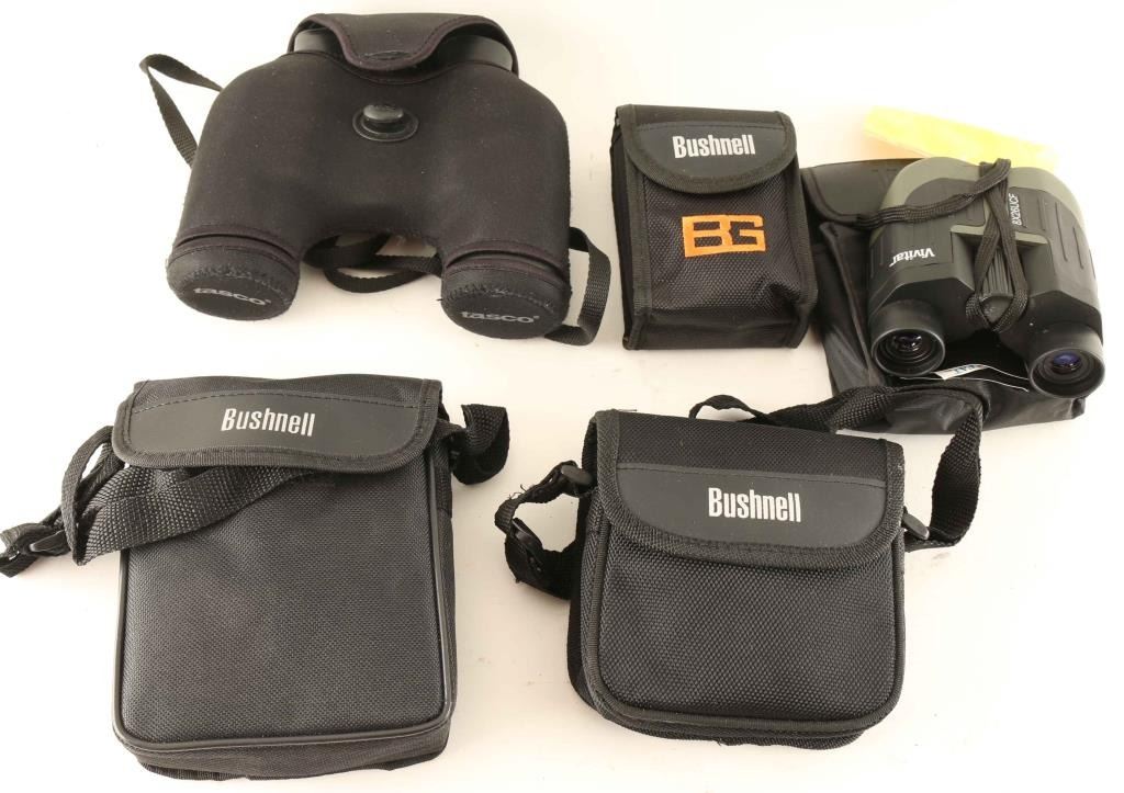 Including; Bushnell Sportsman 10x42, Vivitar 8x26UCF, Bushnell H2o 10x26 waterproof, Tasco Basix 8x40, and a pair of Bushnell BG 8x25 compact binoculars. All in cases, good condiiton.