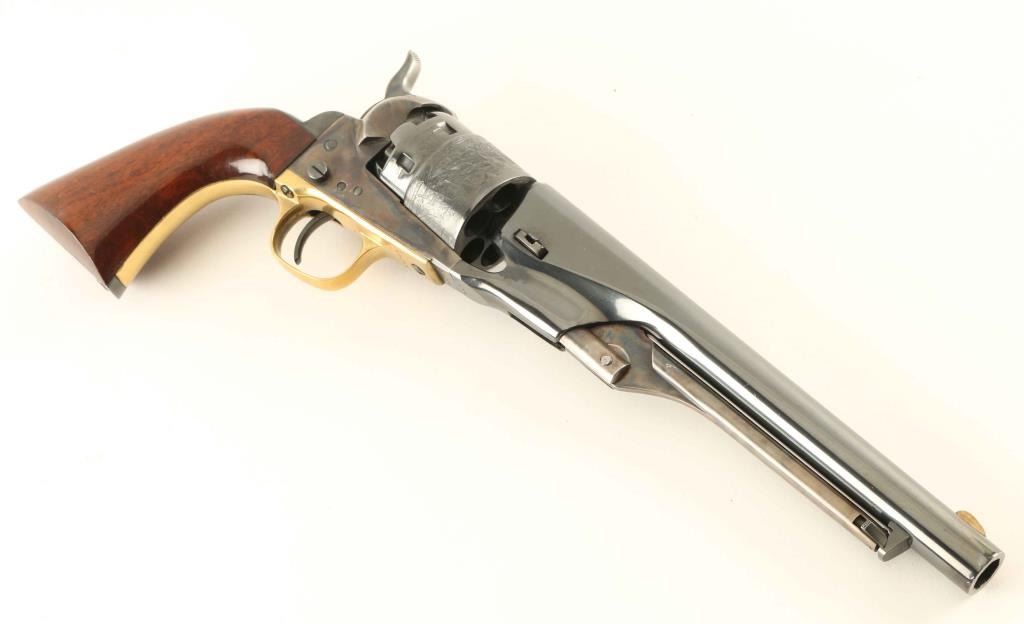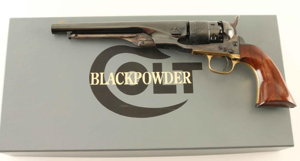 SN: 214774 'Third Generation' Single action percussion revolver chambered for .44 caliber ammunition, manufactured circa 1994-2002 Features a blued & case hardened finish, 8" barrel, brass blade front sight, 'v' notch rear sight cut in the hammer lip, smooth thin trigger, knurled hammer spur, non-fluted six shot cylinder with roll stamped naval engagement scene, loading lever, brass triggerguard, provisions for a shoulder stock, Sam Colt's signature engraved on the backstrap and one-piece varnished walnut grip. Includes a factory one-piece grey cardboard box. Revolver exhibits approximately 95% of it's original finish showing scattered light scratches, some muzzle wear and wear on the front cylinder face from rubbing on the barrel. Action is crisp, the bore is excellent and the wood grip is Very Good. Condition is NRA Very Good++. ***Modern Firearm***