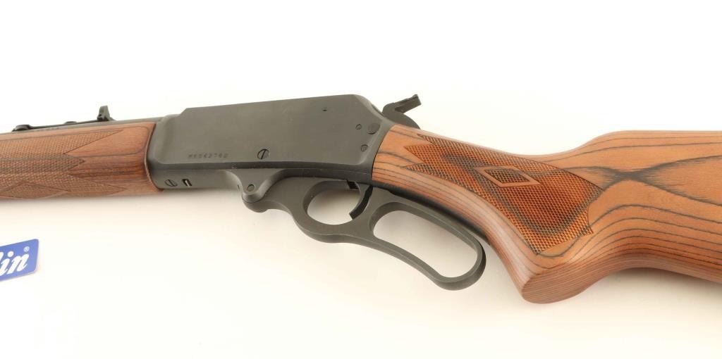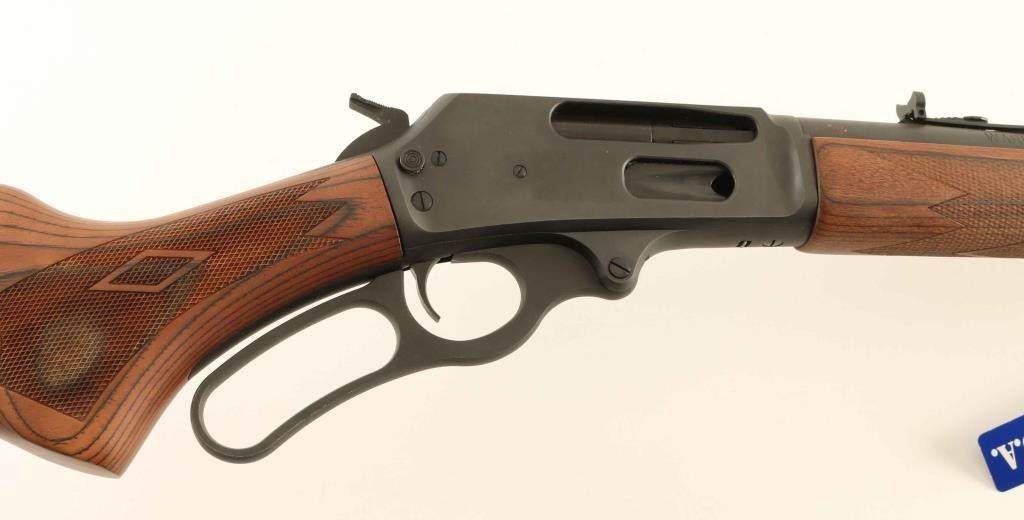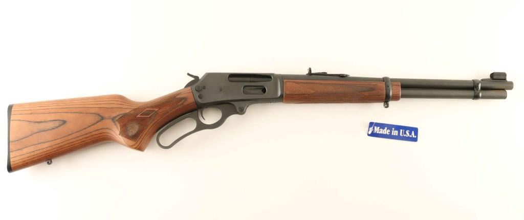 Lever action rifle. 97% Matte black finish, with checkered wood stock and forearm. 16' barrel with hooded front sight. Excellent bore, but a little dirty. Action is crisp and tight. Receiver is drilled and tapped for a scope mount. Rifle is in over excellent condition except there is an area of surface rust on the barrel and tubular magazine on the right side under the front sight, and a coupe of very minor spots of surface rust on the receiver. NRA condition-Very good Modern Firearm.