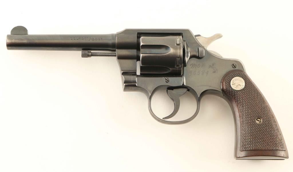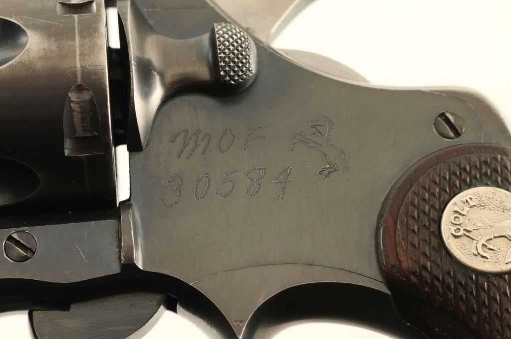 WWII era medium frame double action revolver chambered in .38 Special, manufactured circa 1943. Reportedly owned by Los Angeles County Mounted Deputy Posse. Features a blued finish, 5" tapered barrel, round blade front sight, square notched rear sight, fluted six-shot cylinder, non-shrouded ejector rod, knurled trigger, knurled hammer spur, square butt I frame and two-piece checkered walnut grips with silver Colt medallions. The sideplate is engraved "M O F/30584" and the frame is inscribed "U./S." & "562G" under the left grip. Revolver exhibits approximately 85% of it's original finish showing light holster wear, some scattered handing marks, a small amount of light surface rust and finish loss on the grip straps. Action is smooth with solid lock-up, the bore is excellent and the wood grips are good with small losses to the toe on the right panel. Condition is near NRA Very Good. ***C&R Firearm***