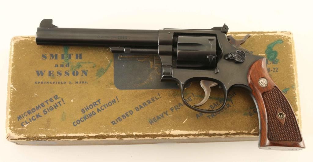 'The K-38 Target Masterpiece' Vintage medium frame double action target revolver chambered in .38 Special, manufactured circa 1949. Features a blued finish, pinned 6" barrel with partially serrated wide sighting rib, raised 1/8" patridge front sight, micrometer click adjustable rear sight, non-shrouded ejector rod, fluted six-shot cylinder, serrated .265" anti-backlash trigger with adjustable stop, short cocking action, .375" short throw semi-target hammer, square butt K target frame with six groove grip straps, and two-piece diamond checkered walnut Magna grips with silver S&W medallions. Includes the original factory two-piece gold cardboard picture box with gold metal corners. All observed serial numbers are matching. Revolver exhibits approximately 94% of it's original finish showing minor high point edge wear, a drag line on the cylinder, some scattered superficial scratches, a small bright spot of finish loss on the right side of the frame and some light emerging surface rust on the cylinder & in the grooved on the backstrap. Action is smooth with very good lock-up, the bore is pristine and matching wood grips are very good++. Condition is near NRA Very Good in box. ***C&R Firearm***