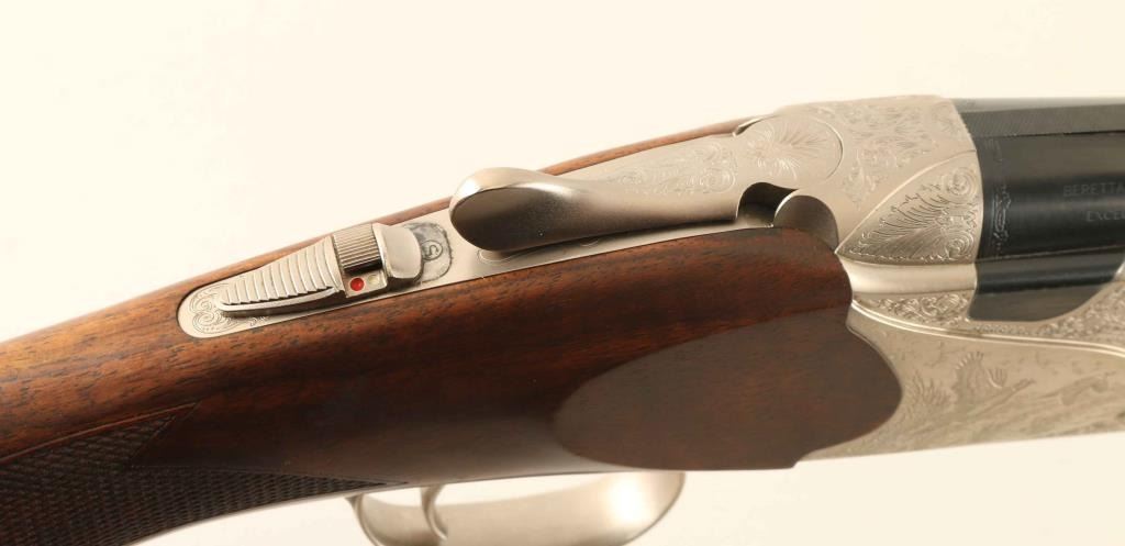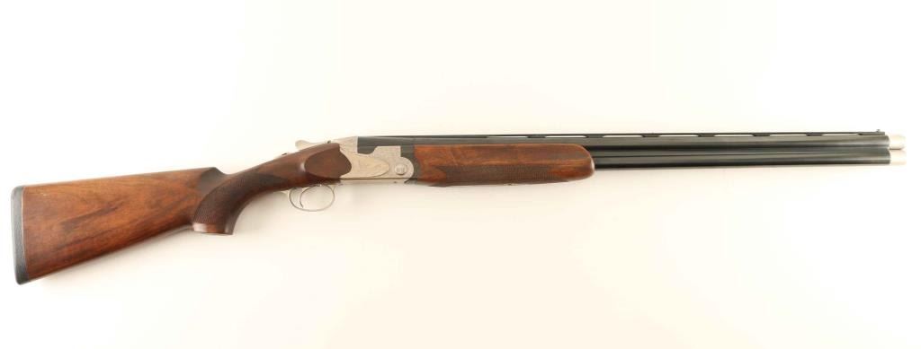 Fine Italian made over/under double barrel shotgun manufactured in 2009. Features blued 28" barrels with ventilated sighting rib & removable skeet/skeet extended choke tubes, selectable ejectors, white bead front sight, silver bead mid-sight, removable trigger group with smooth titanium selective trigger, sliding tang safety/barrel selector, nickel finished receiver with laser engraved floral scroll & game scenes on the side panels, smooth top lever, checkered semi-beavertail wood forend with oil finish and Q-stock pistol grip shoulder stock with factory recoil pad. Stock dimensions: drop at comb 1.35", drop at heel 2.1", and length of pull 14 3/4". Includes the original factory hard case with compartmentalized interior and documents. Shotgun exhibits approximately 99% of it's original finish showing only light scattered handling marks/scratches. Action is smooth, the bores are excellent and the wood stocks are very good with a 1" hairline crack extending from the upper tang. Condition is near NRA Excellent in case. ***Modern Firearm***