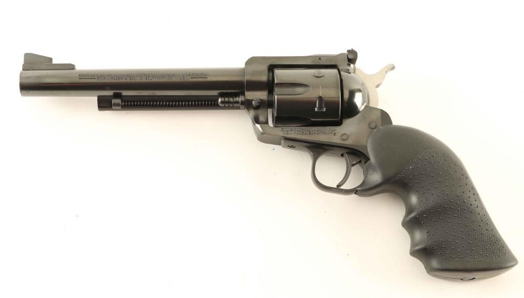 Revolver,6-shot, single- action. 96% blued finish, with Hogue black rubber grips. 6 1/2" barrel, with adjustable rear sights. Action is tight, and the cylinder indexes properly. Bore is excellent/bright. Cylinder chambers appear very good, but dirty. Some minor scratches on the metal, and a little loss of finish in the cylinder grooves. Slight drag lines on the cylinder. NRA Condition-Very good. Modern firearm.