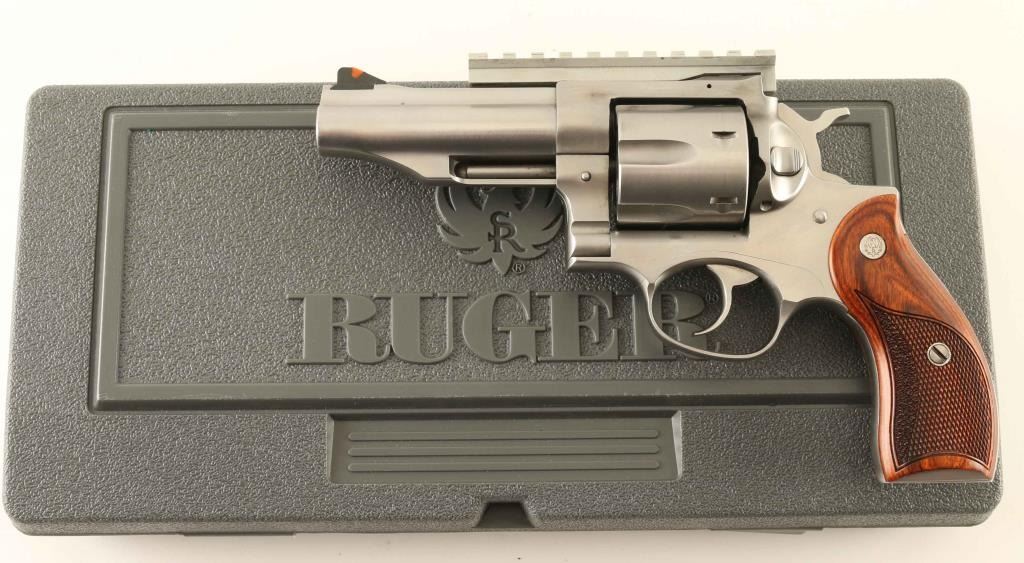 Stainless steel large frame double-auction revolver chambered both .45 Colt & .45 ACP with a single cylinder, manufactured circa 2015. Features a satin stainless finish, 4.2" barrel with serrated sighting rib, dovetailed serrated ramp front sight with orange insert, removed rear sight, installed optic rail, smooth trigger, knurled hammer spur, transfer bar safety, fluted six-shot cylinder, shrouded ejector rod, and two-piece brown laminated wood grips with medallions, stippling & checkering. Includes the original factory hard case with documents, lock, original rear sight, spent case and three moon clips. The head to one of the screws securing the rail to the frame has sheared off. Revolver exhibits moderate handling wear. Action is smooth with good lock-up, the bore is excellent with a lightly impressed ring 1.5" from the muzzle, and the wood grips are near fine. Condition is NRA Very Good+. ***Modern Firearm***