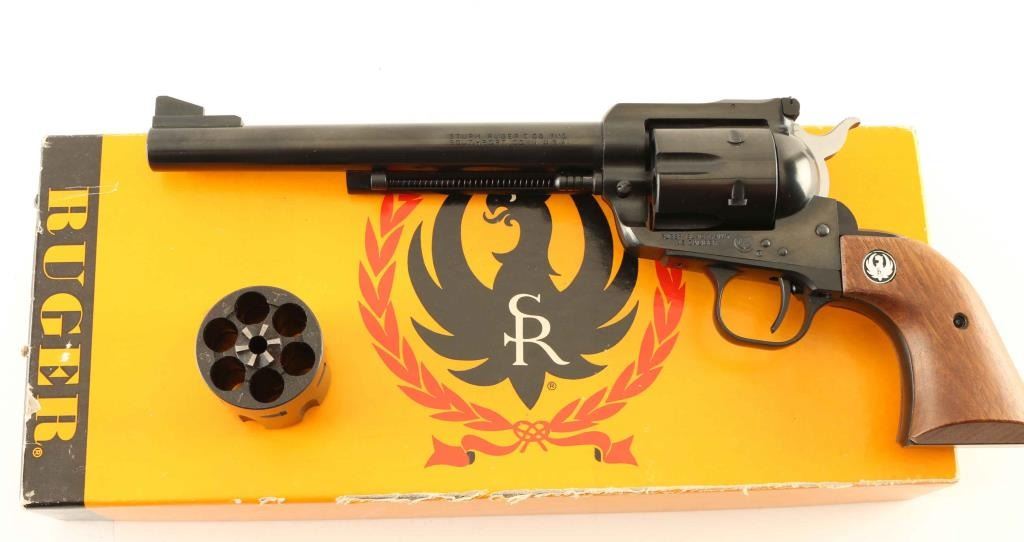 Revolver, 6-shot, single action, 98% blued finish, with smooth wood grips. 7 1/2" barrel. Adjustable rear sights. Chrome trigger. Bore appears excellent,, but is dirty/dusty. Cylinder chambers are about the same. Action is tight, and cylinder indexes properly. Has transfer bar. A 1983 receipt from the Sturm, Ruger co. where the previous owner had the barrel , trigger, hammer, replaced is included. The old cylinder pin, trigger, hammer, cylinder stop, are in the box. Also in the box is a extra-wide serrated trigger extension. There are some very light scratches, and some wear in the inside the frame. Comes in the original Black/yellow Box, with the above mentioned items, and the paperwork, and conversion cylinder.. Needs a good cleaning. NRA condition-Very good. Modern firearm.
