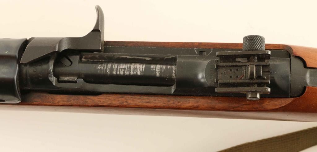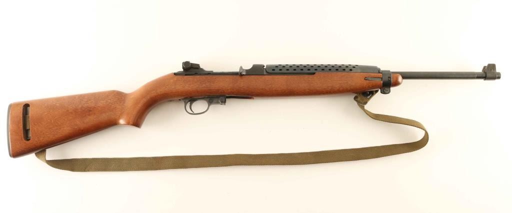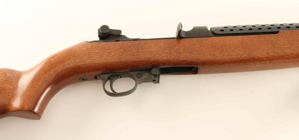 Commercial post-war production U.S. M1 Carbine pattern semi-automatic rifle chambered in .30 Carbine. Features a blued finish, 18" barrel, shrouded blade front sight, adjustable sliding aperture rear sight, smooth trigger, round bolt, push button safety, push button magazine release, no magazine, wide barrel band, green canvas sling, oiler, ventilated metal handguard, and smooth wood pistol grip shoulder stock with low wood forend & textured metal buttplate. Rifle retains approximately 70% of it's blued finish showing heavy wear on the bolt, scattered handling marks and some light surface rust. Action is smooth, the bore appears excellent but is dirty, and the wood stock is near fine. Condition is near NRA Good. ***Modern Firearm***